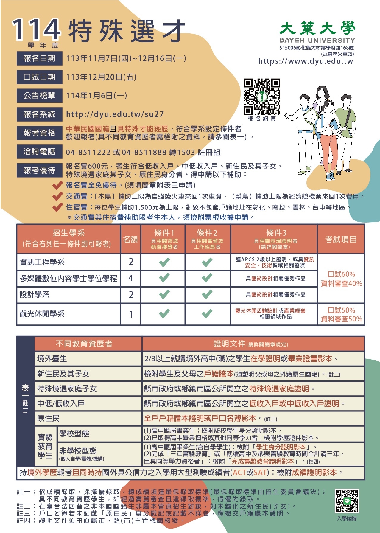 | 2024/11/06 大葉大學114學年度特殊選才招生考試資訊 |