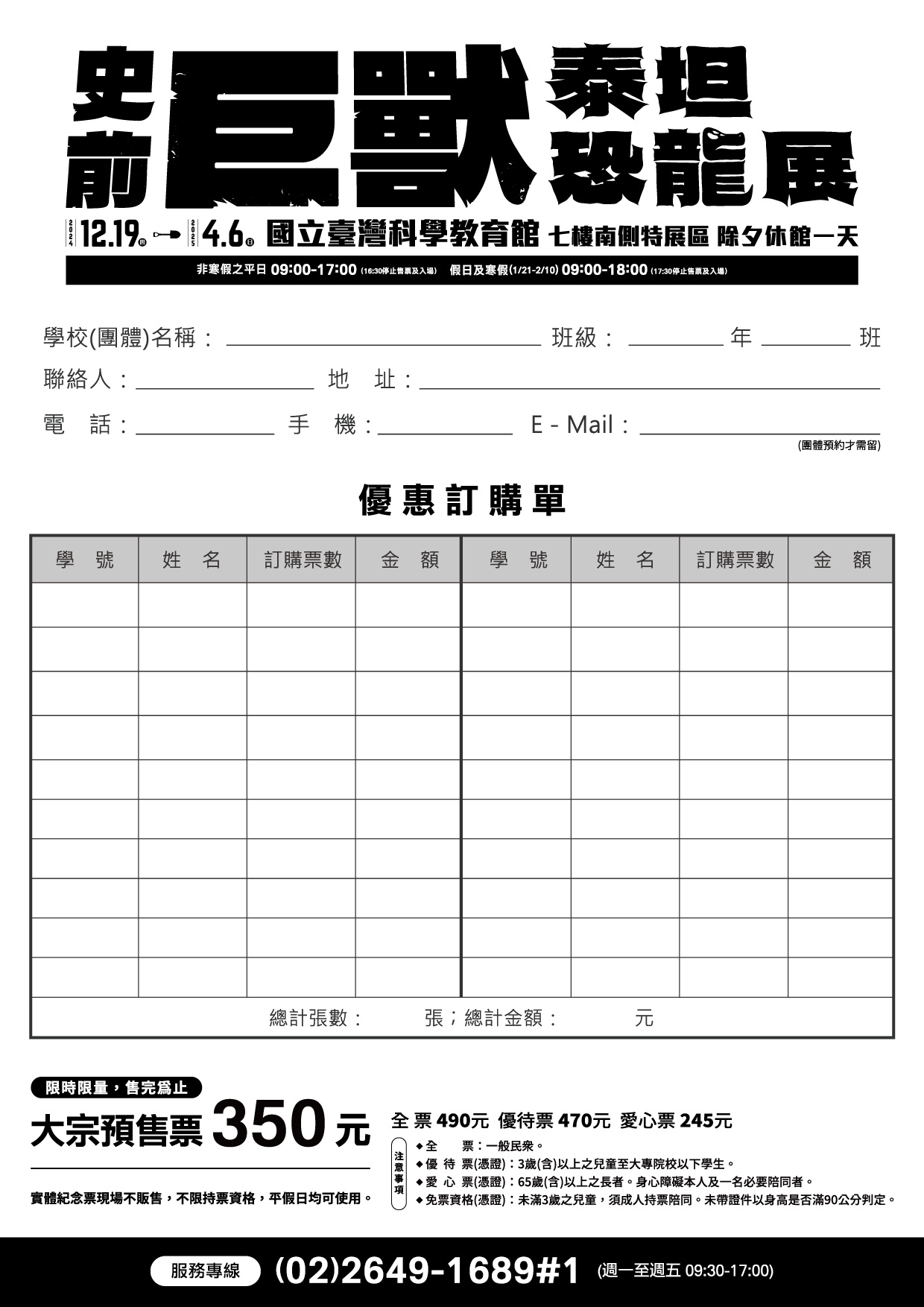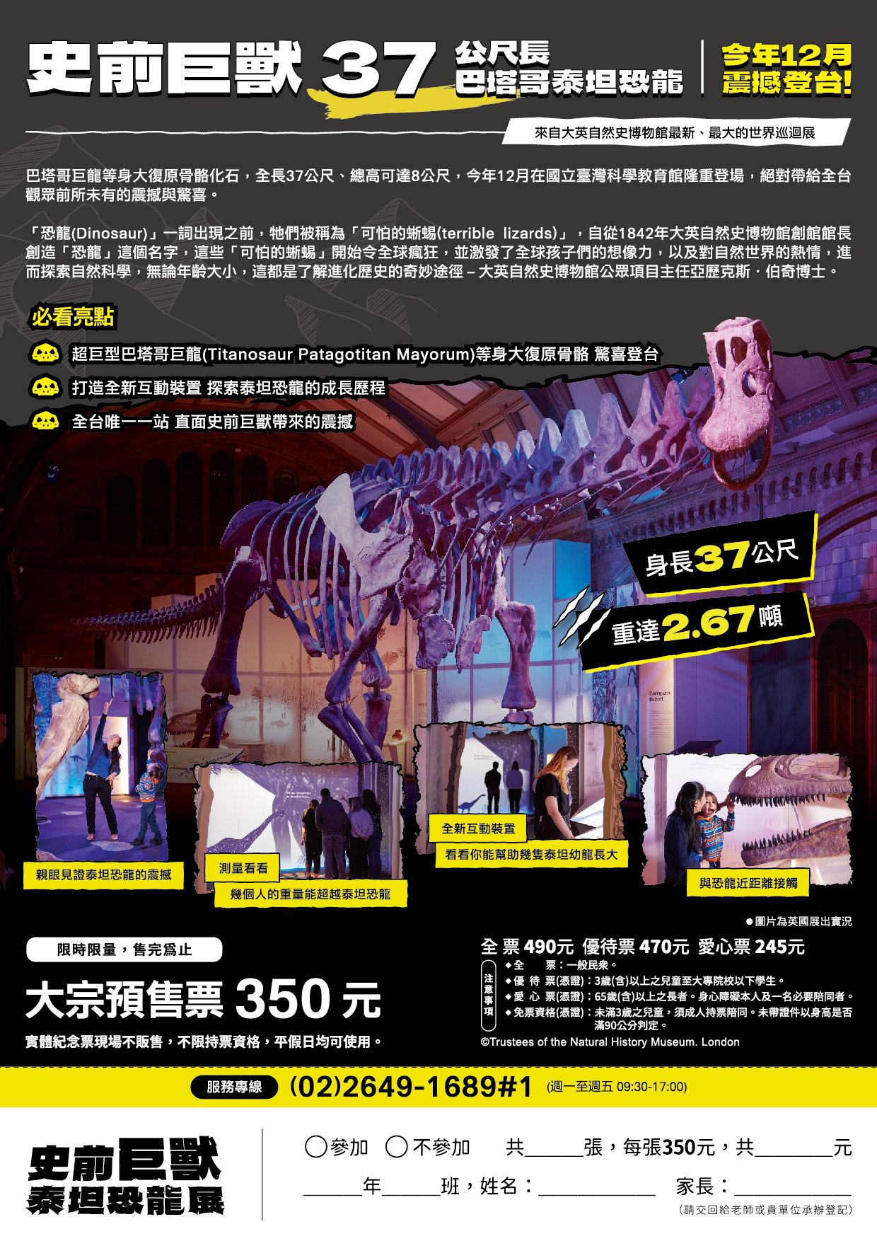 附加檔案:國立臺灣科學教育館七樓南側特展區舉辦「史前巨獸泰坦恐龍展」.pdf (385.63 KB)