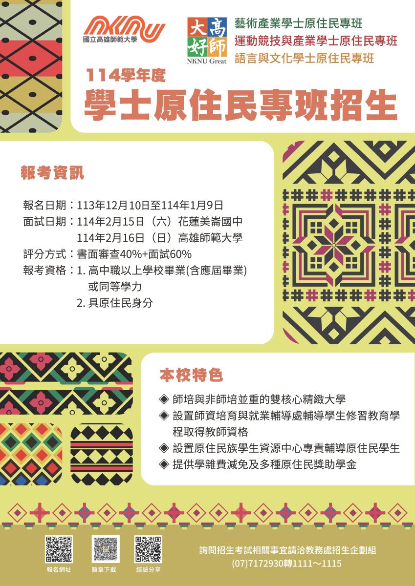 | 2024/11/26 國立高雄師範大學114學年度學士原住民專班招生資訊 |