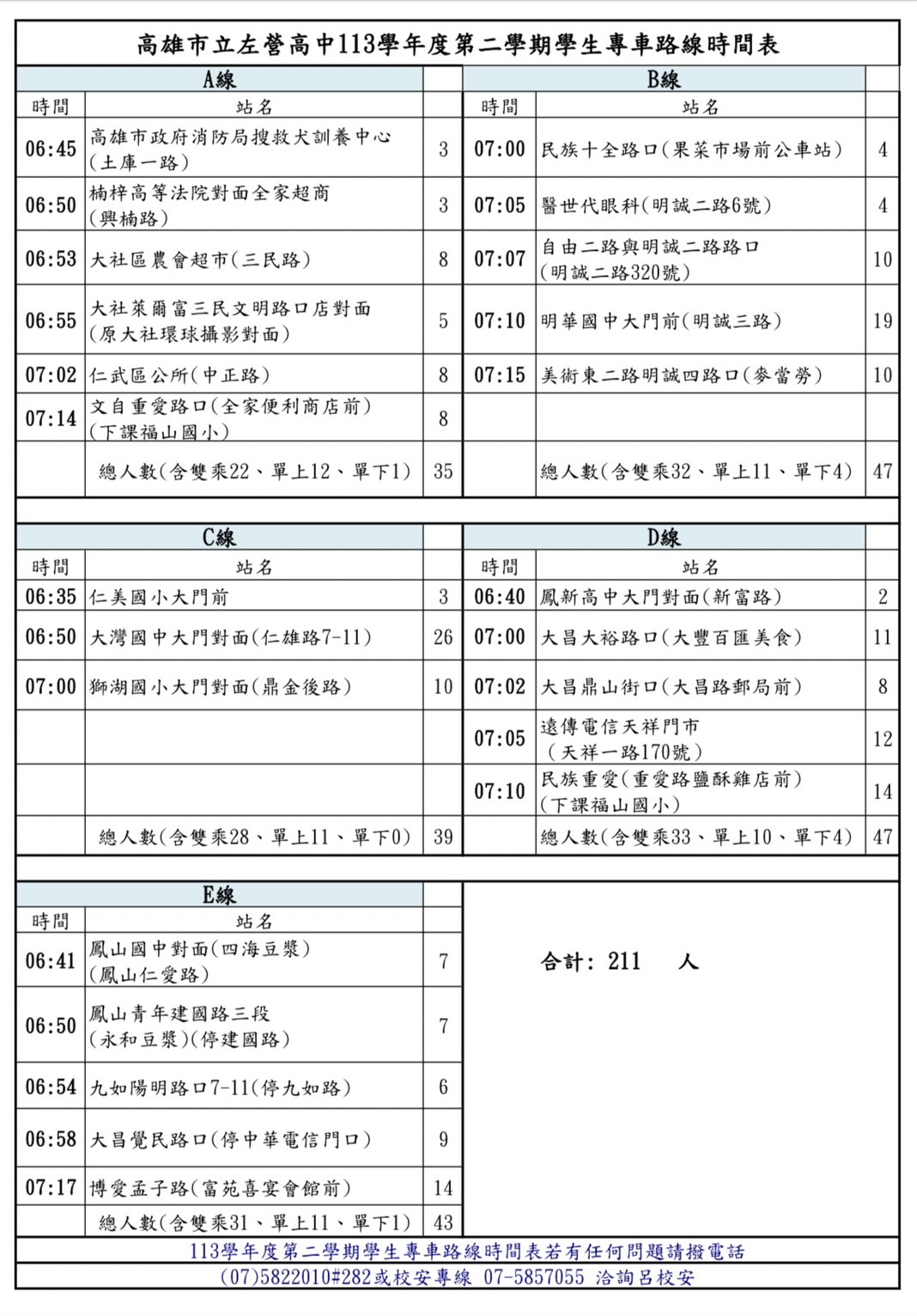| 2025/02/10 2/10更新 [校車資訊] 113學年第2學期學生交通車座位表/路線時間及搭乘學生名冊(ABCDE計併車5線) |
