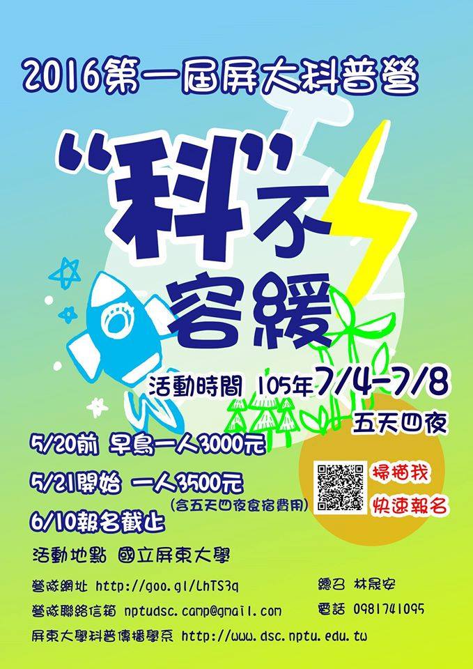 | 2016/05/20 國立屏東大學科普傳播學系辦理暑期活動營隊-「屏大科普營:“科”不容緩」宣傳海報及簡章 |