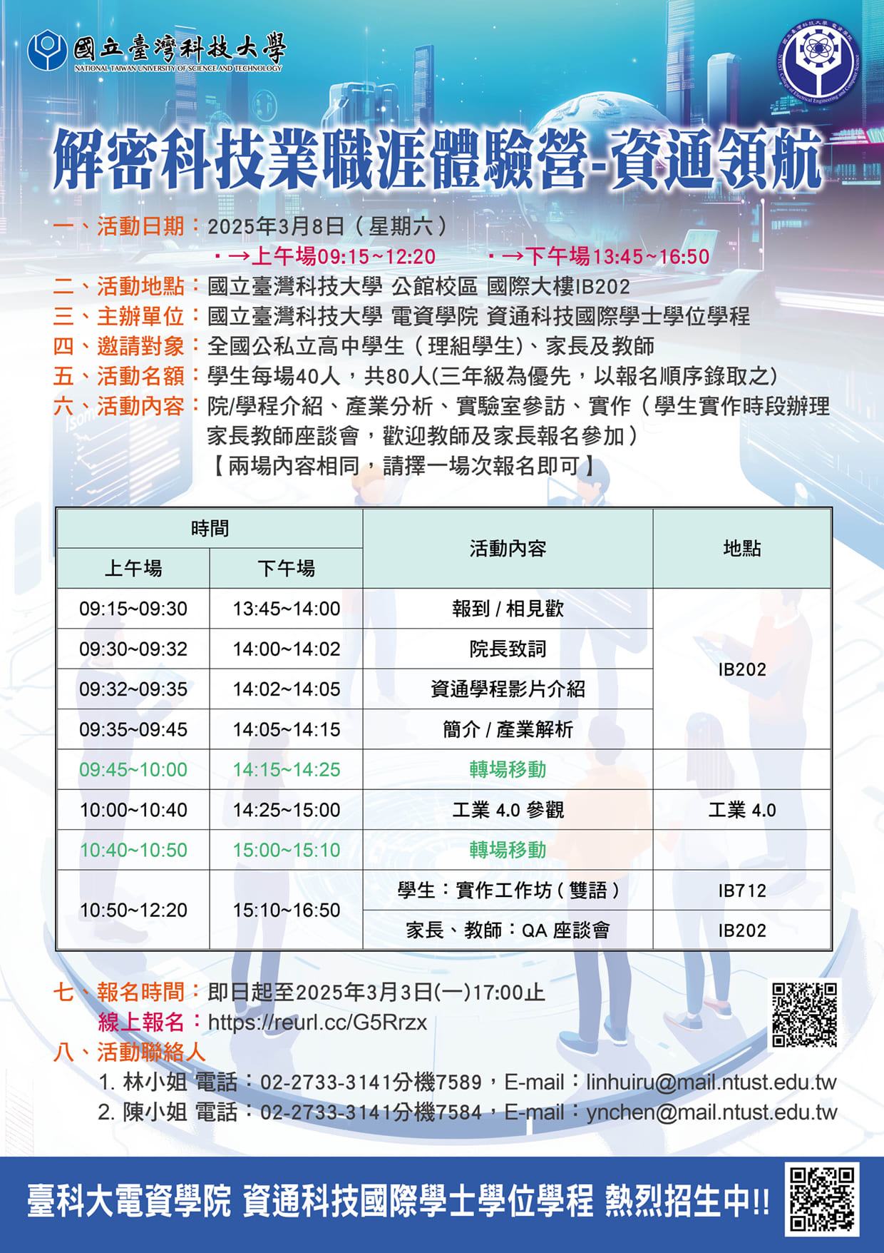 二、為協助學、家長、教師了解本學程之特色與規劃,於114年3月8日舉辦「解密科技業職涯體驗營_資通領航」。【兩場內容相同,請擇一場次報名參加即可】