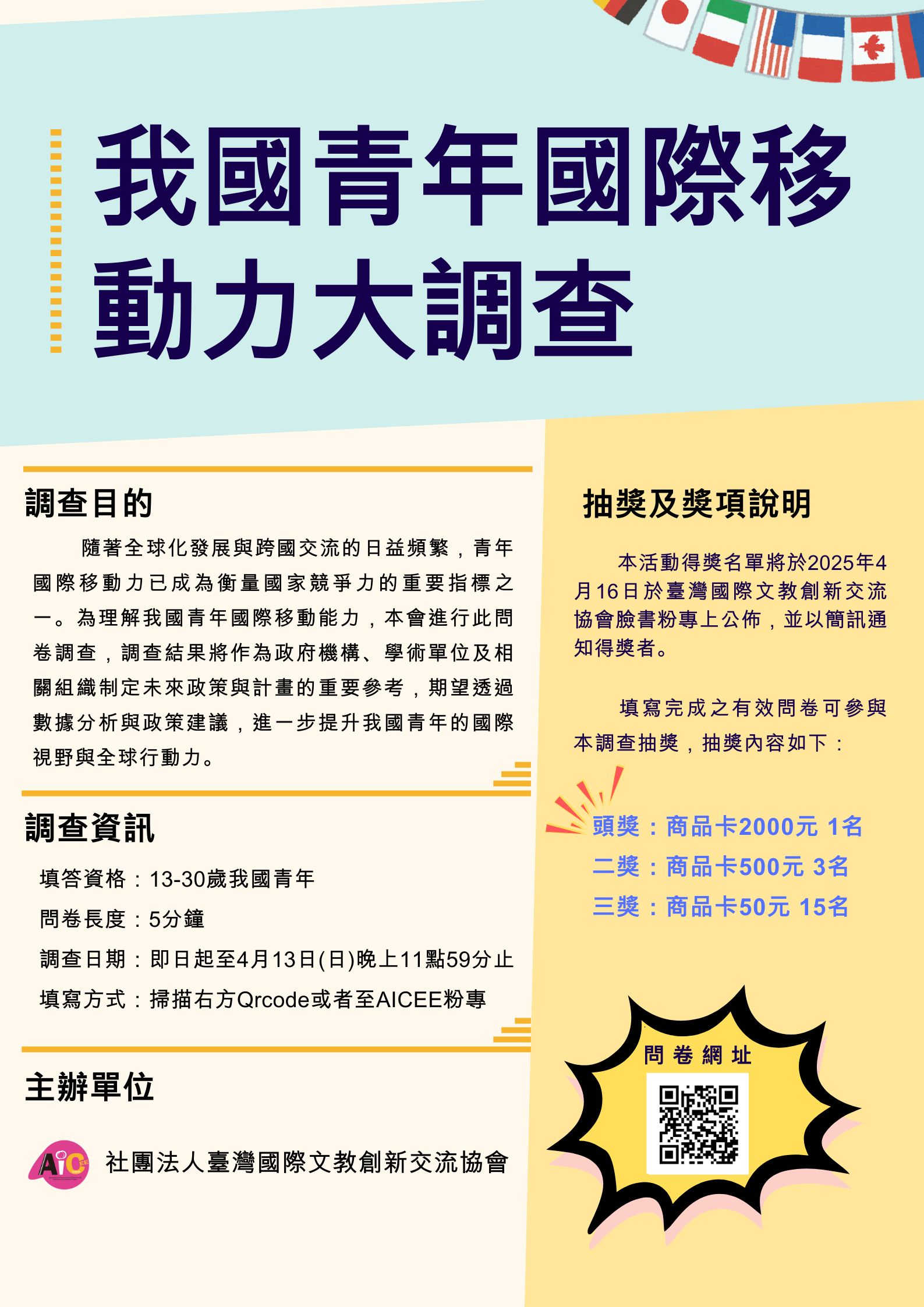 | 2025/03/14 轉知社團法人臺灣國際文教創新交流協會為貼近理解青少年國際移動能力,特規劃「我國青年國際移動力大調查」,惠請學生上網填寫問卷 |