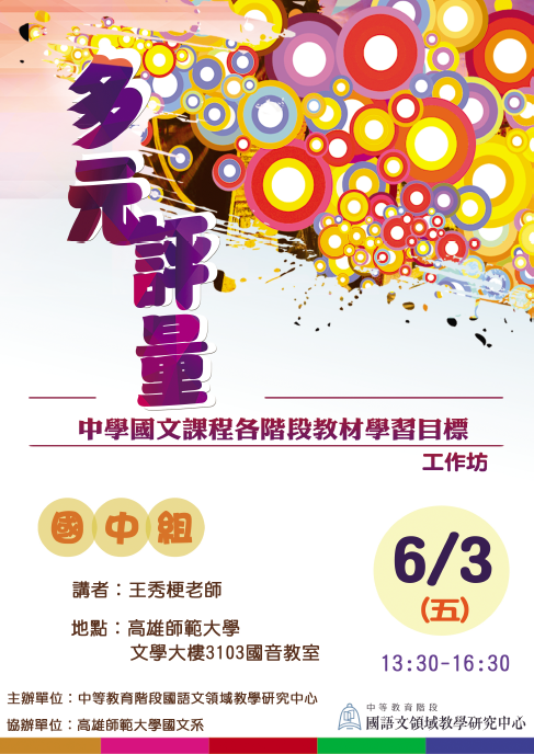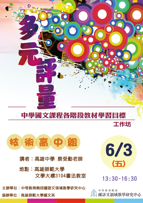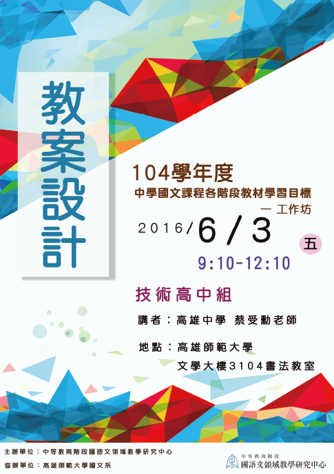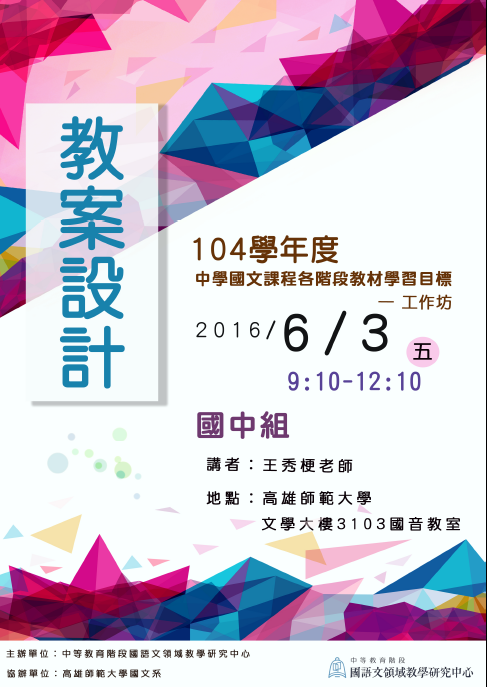 | 2016/05/25 國立高雄師範大學辦理「中學國文課程各階段教材學習目標教案設計工作坊」等 |