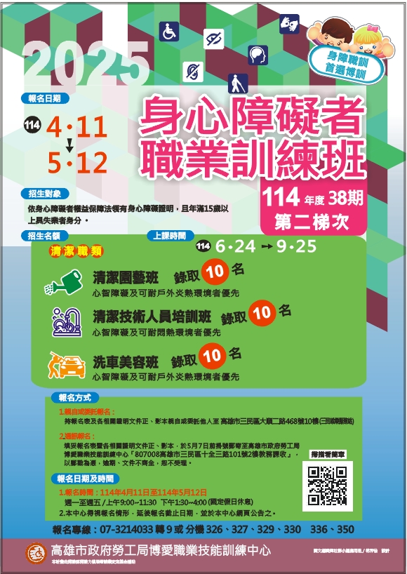 | 2025/03/19 114年度(第38期)身心障礙者職業訓練班第二梯次招生簡章 |