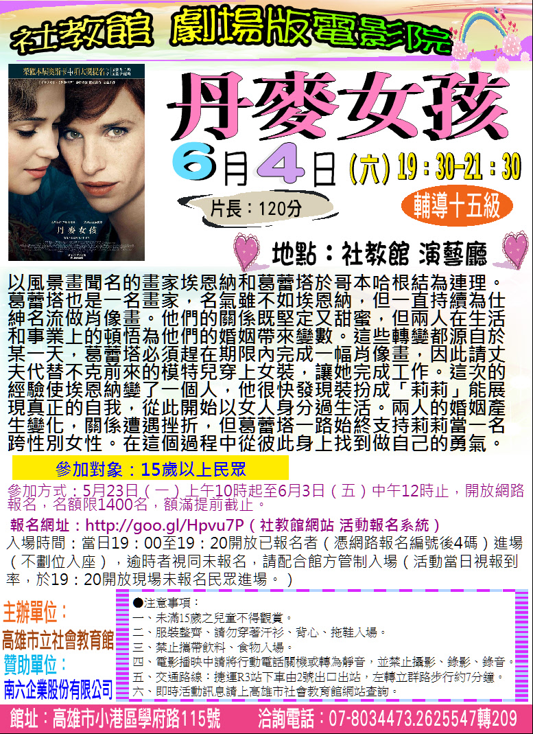 | 2016/05/25 高雄市立社會教育館館『劇場版電影院』於6月4日播映《丹麥女孩》 |