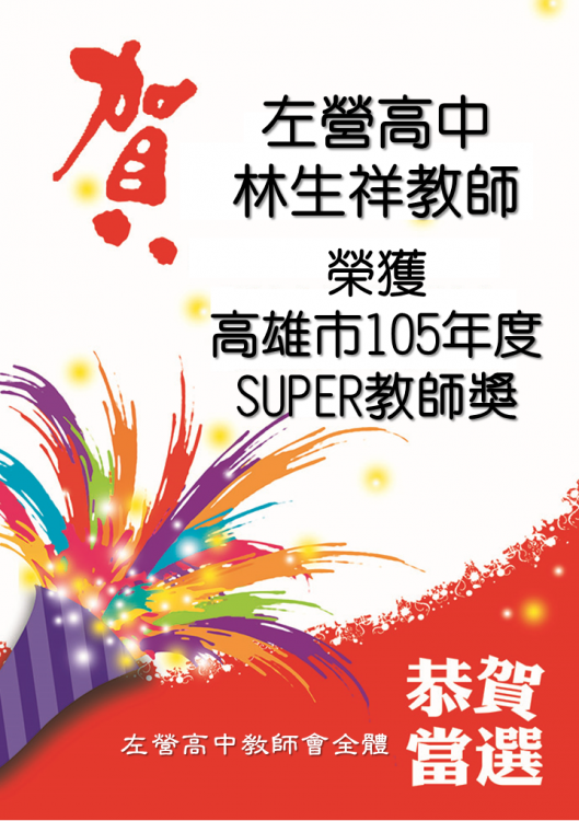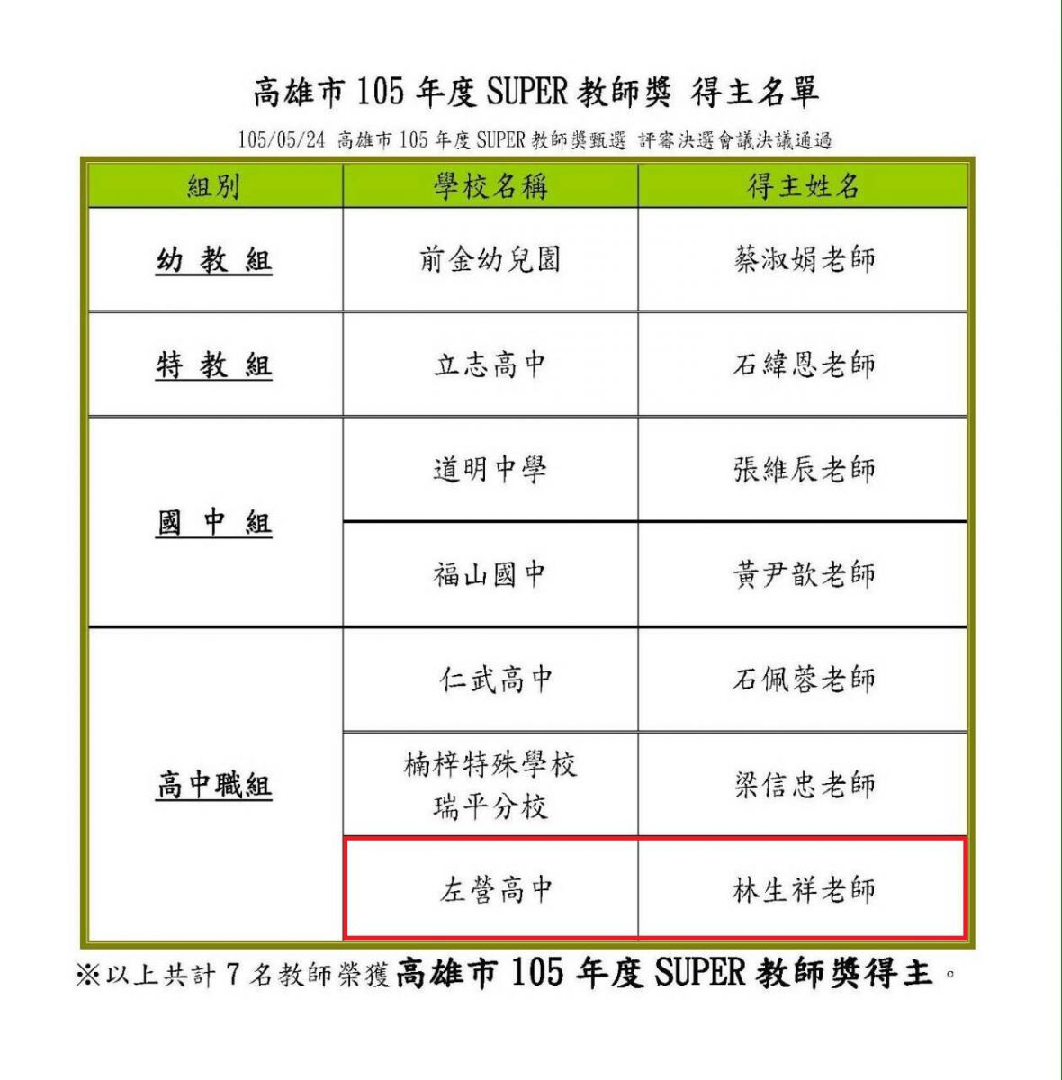 欣賀林生祥老師榮獲高雄市105年SUPER教師獎