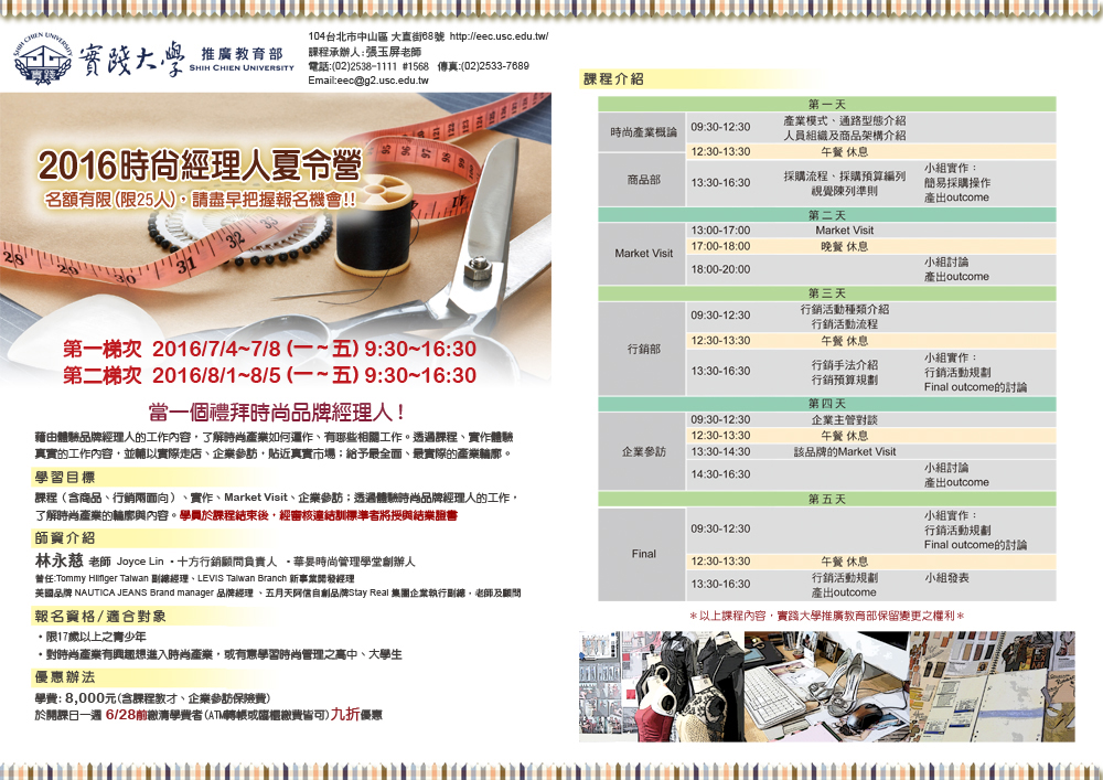 時尚經理人夏令營:(02)25381111分機1568。