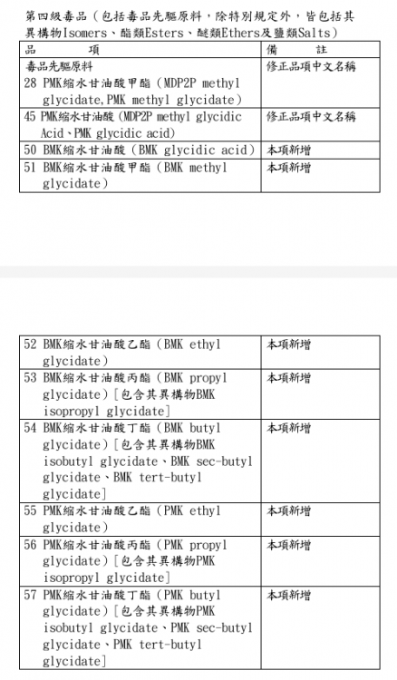 新增正丙帕酯(Propoxate)為第二級毒品,四氫大麻丙酚(Tetrahydrocannabivarin、THCV)為第三級毒品,縮水甘油酸甲酯( BMK methylglycidate)及縮水甘油酸( BMK glycidic acid) 等為第四級毒品。