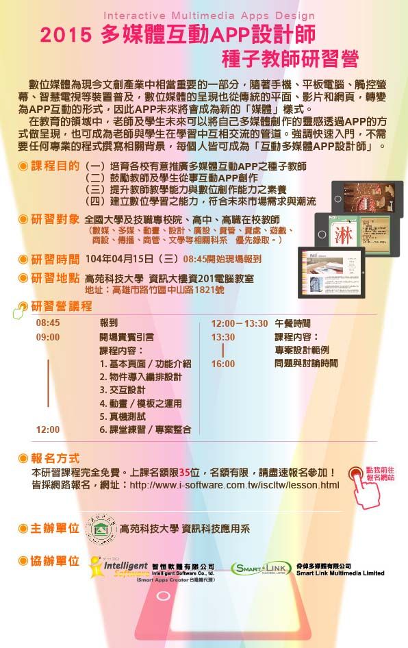 | 2015/04/09 高苑科技大學資訊科技應用系舉辦「多媒體互動APP設計師-Interactive Multimedia Apps Design種子教師研習」 |