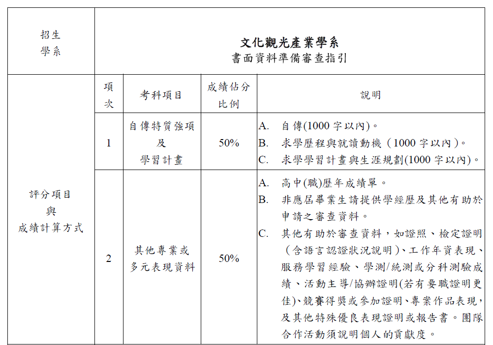 一、免繳報名費,審查資料檔案上傳占比:自傳特質強項及學習計畫50%、其他專業或多元表現有利資料50%。