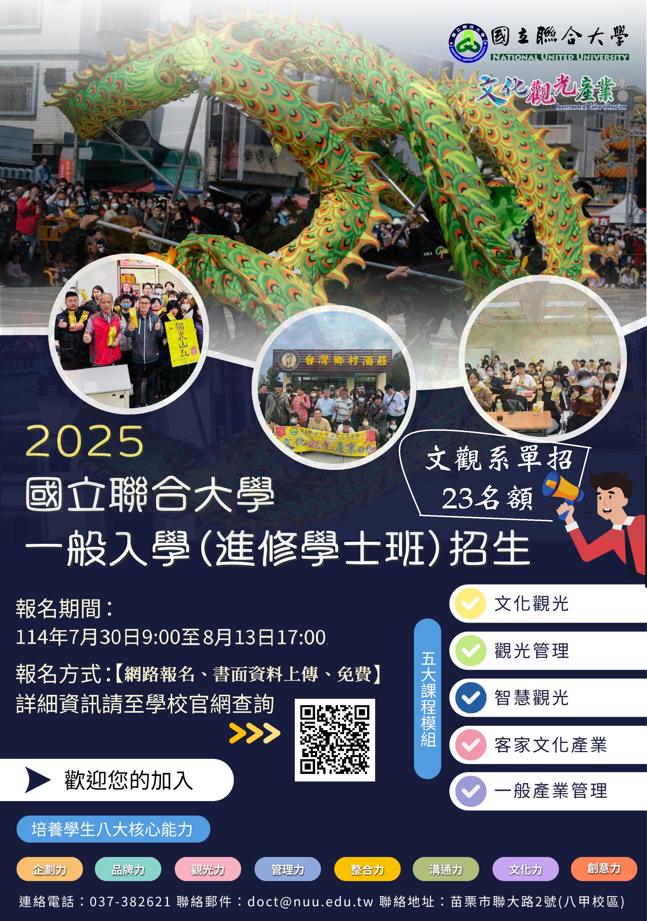 | 2025/08/04 國立聯合大學文化觀光產業學系114學年度進修部招生資訊 |