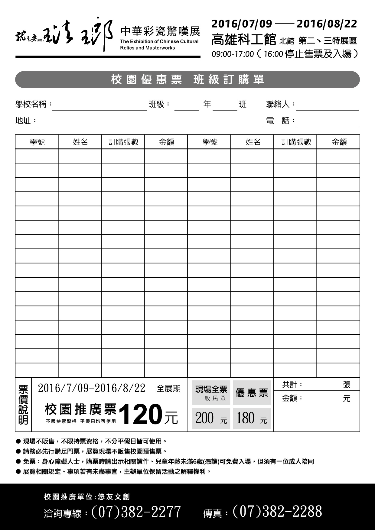 活動推廣部優惠預購票服務專線,專線電話:07-3822277;傳真:07-3822288。