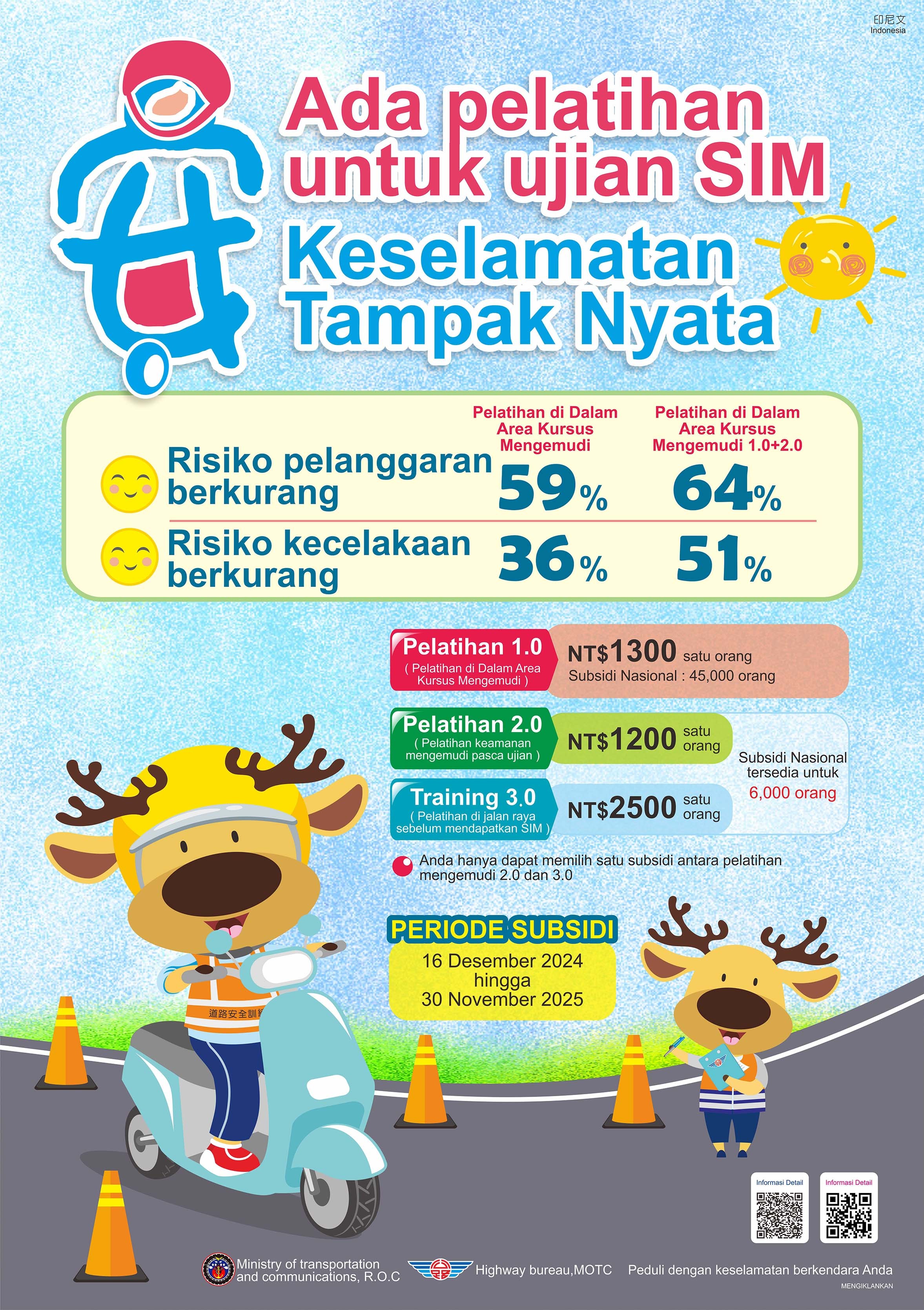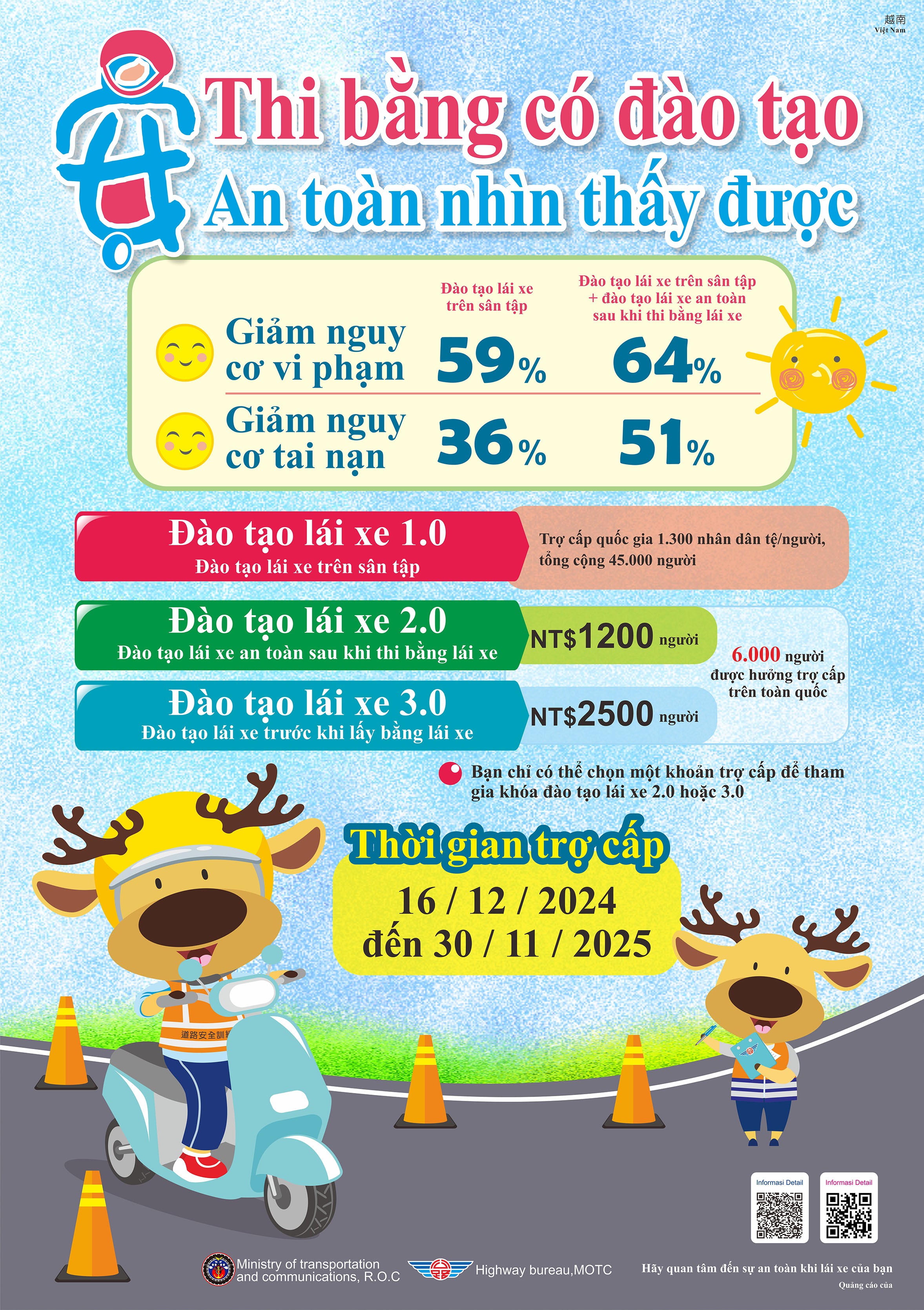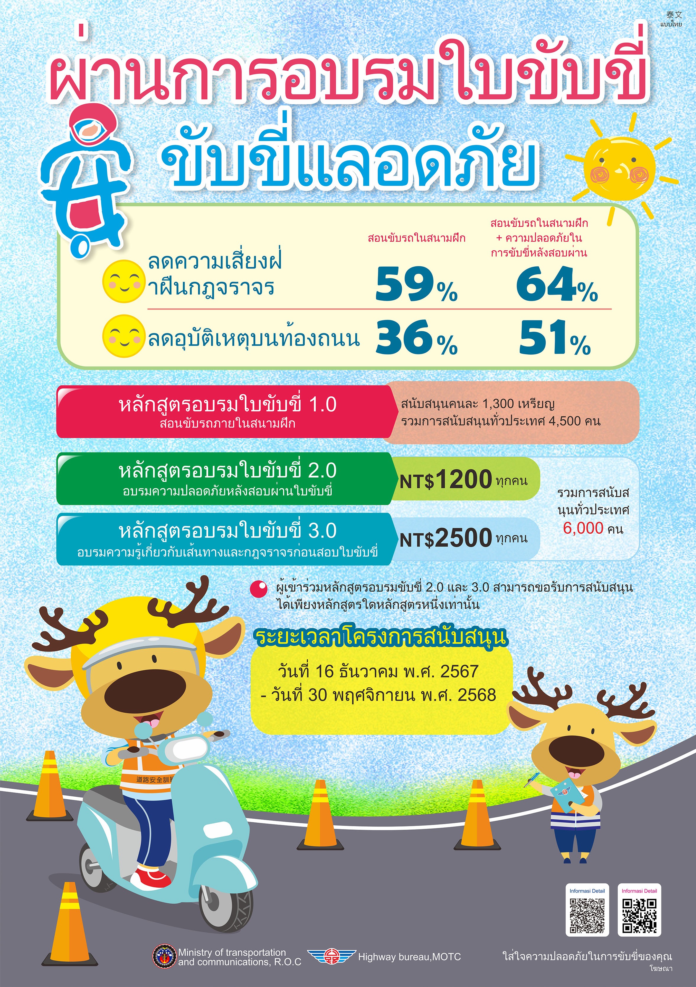 二、為強化學生機車安全駕駛觀念、降低交通意外之風險,並防範外籍人士交通事故,交通部公路局提供多國語言機車駕訓補助文宣,包含中文、英文(菲律賓)、越南文、印尼文及泰文,請利用旨揭文宣資料加強宣導,鼓勵學生(含僑生)參加機車駕訓班,建立正確駕駛觀念與培養安全駕駛能力。