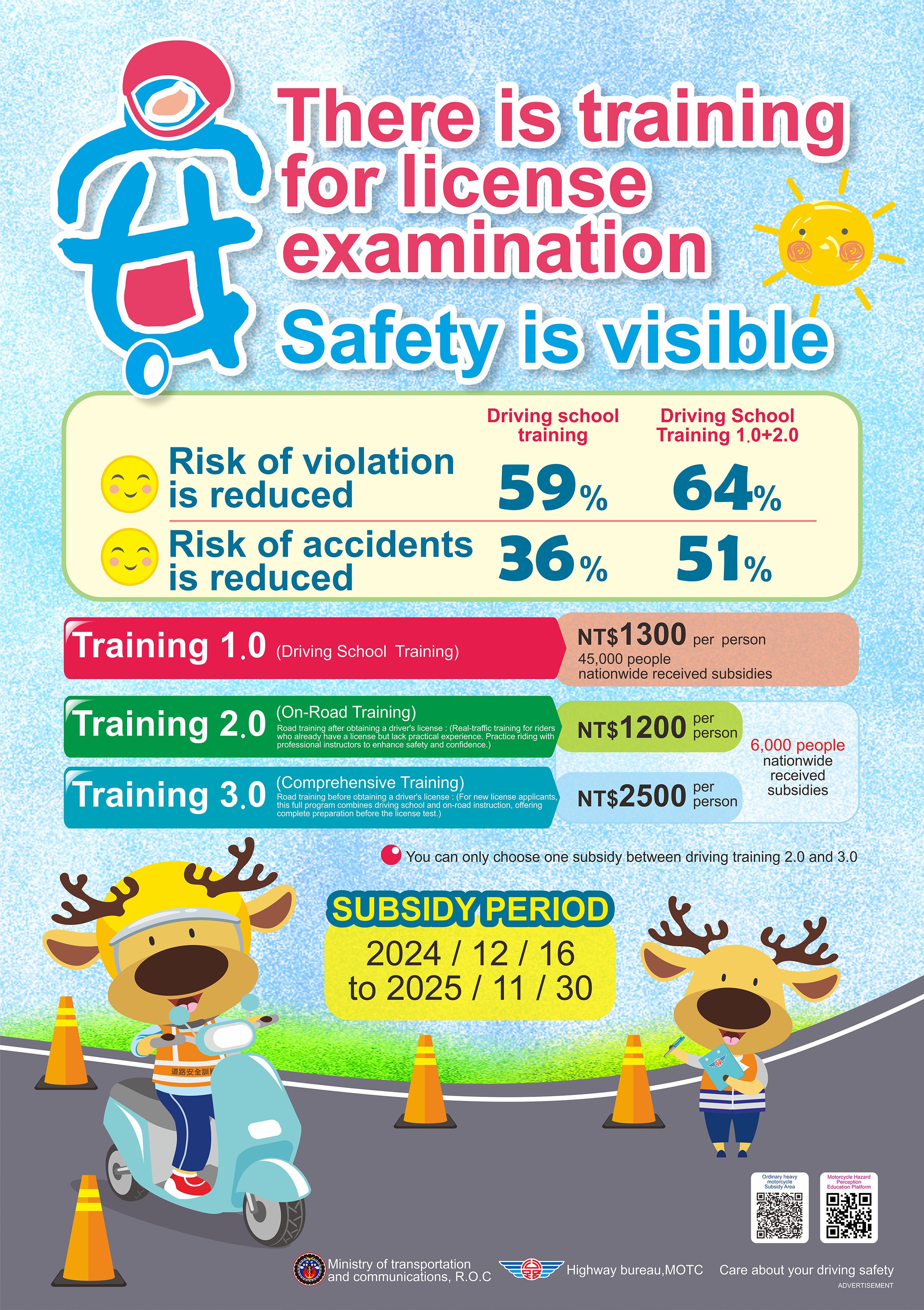 主旨:函轉交通部公路局機車駕訓補助宣導文宣(中文及多國語言版)1份,請查照。