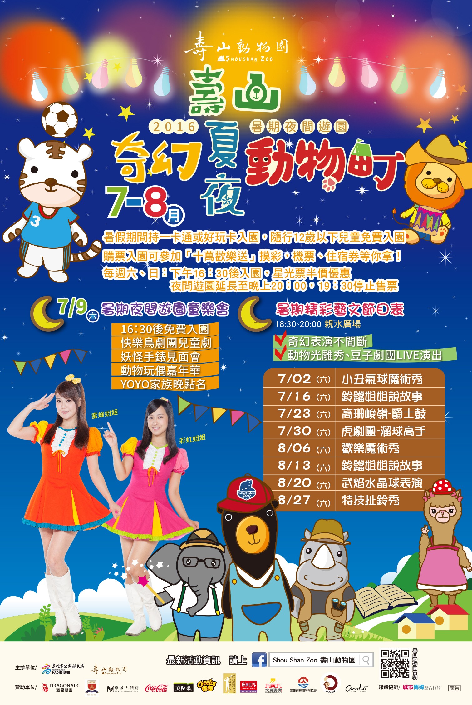 二、壽山動物園2016暑期夜間遊園童樂會訂於105年7月9日晚間7時假園區親水廣場舉行,當日
