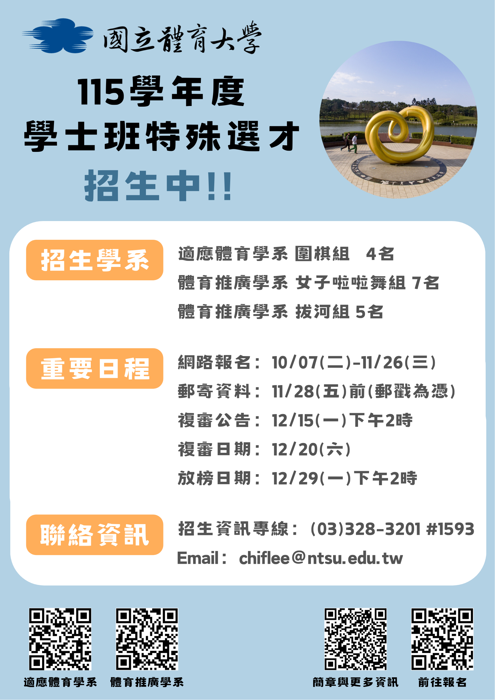 | 2025/09/18 國立體育大學115學年度學士班特殊選才招生資訊 |