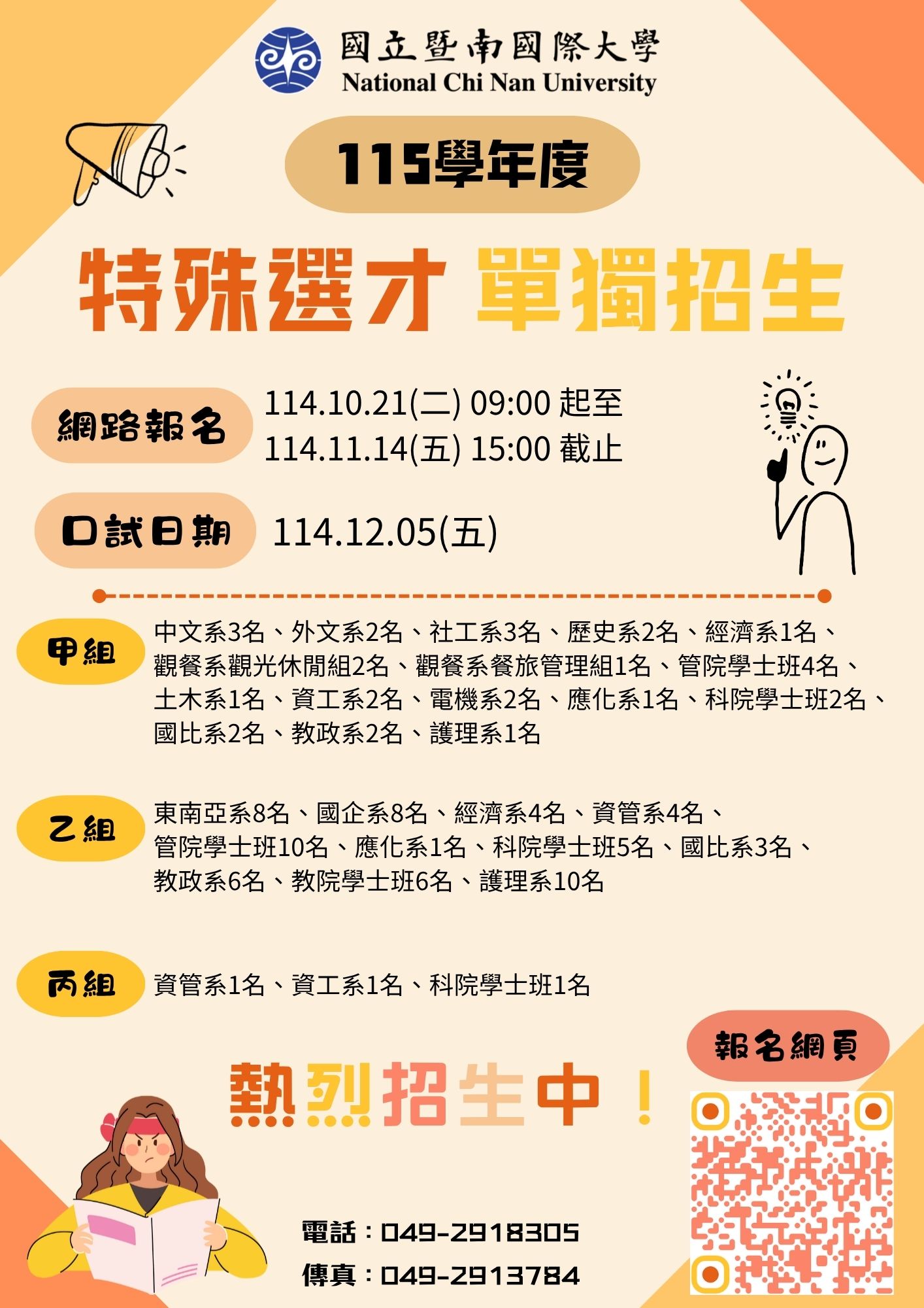 一、國立暨南國際大學115學年度特殊選才單獨招生網路報名自114年10月21日起至114年11月14日止。