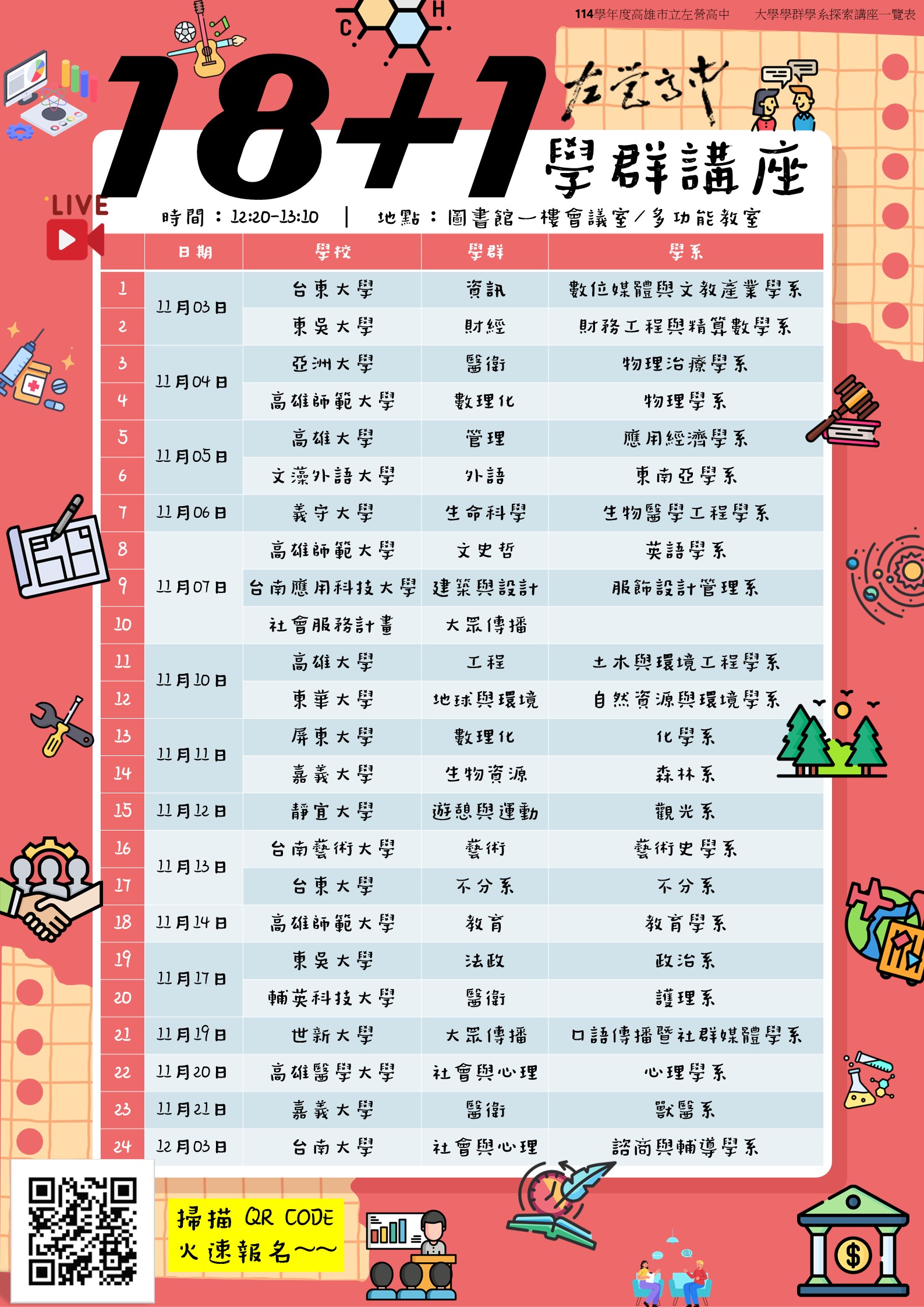 | 2025/10/23 11/3~12/3舉行24場學群講座,歡迎同學自由報名參加 |