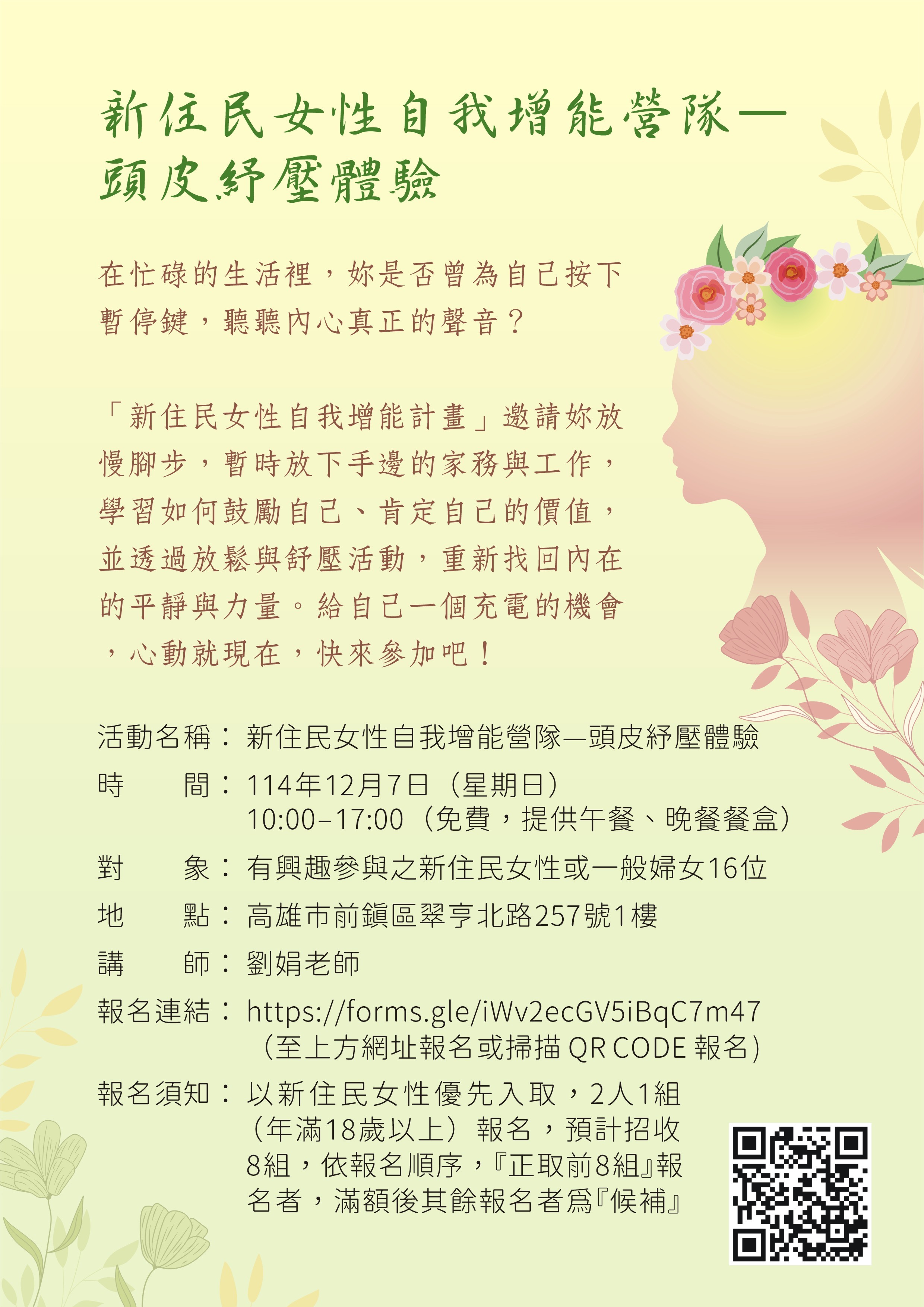 (三)活動對象:本市婦女朋友(新住民女性優先錄取、一般民眾亦可報名)。