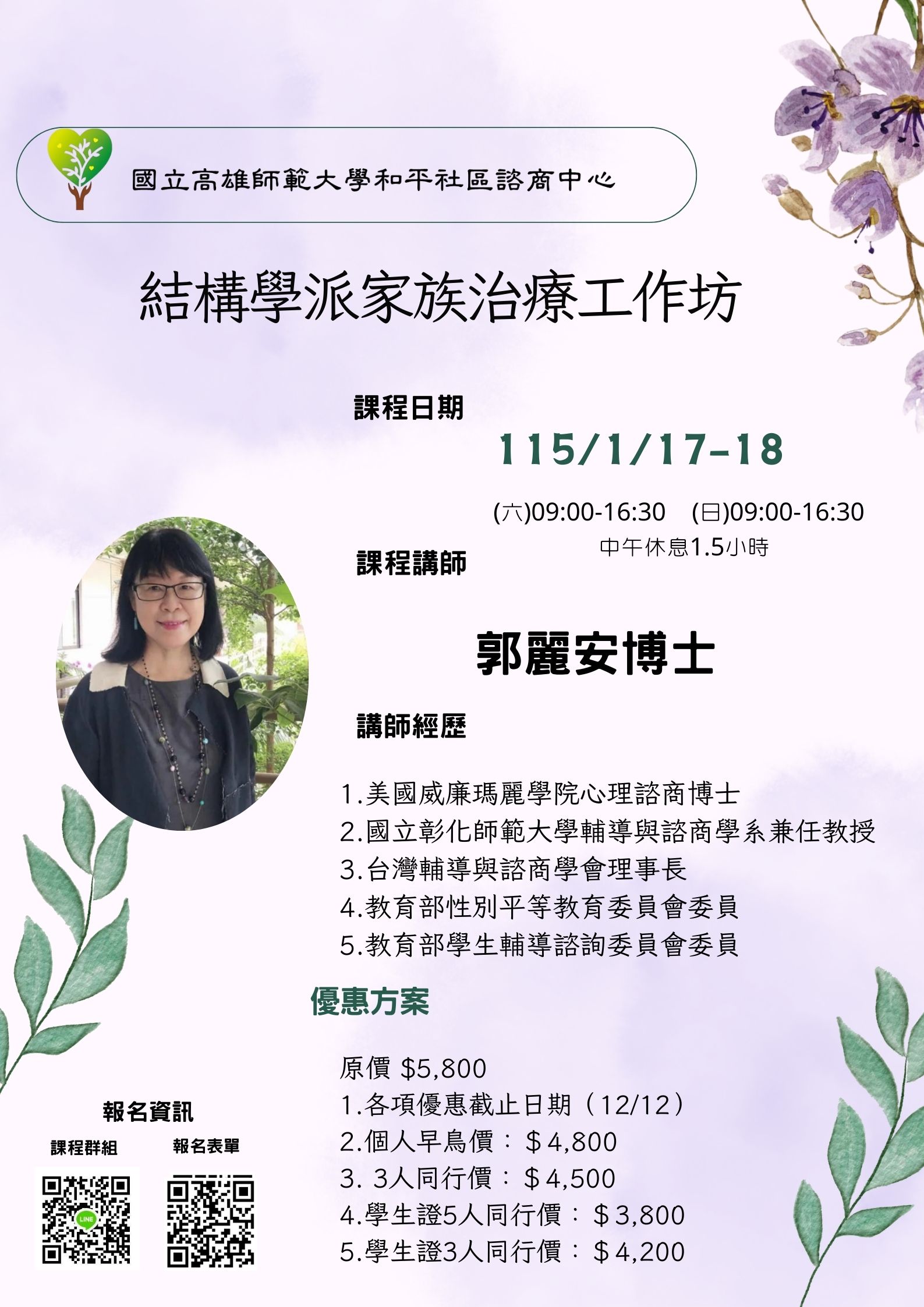 | 2025/11/17 國立高雄師範大學【和平社區諮商中心辦理「結構學派家族治療工作坊」】 |