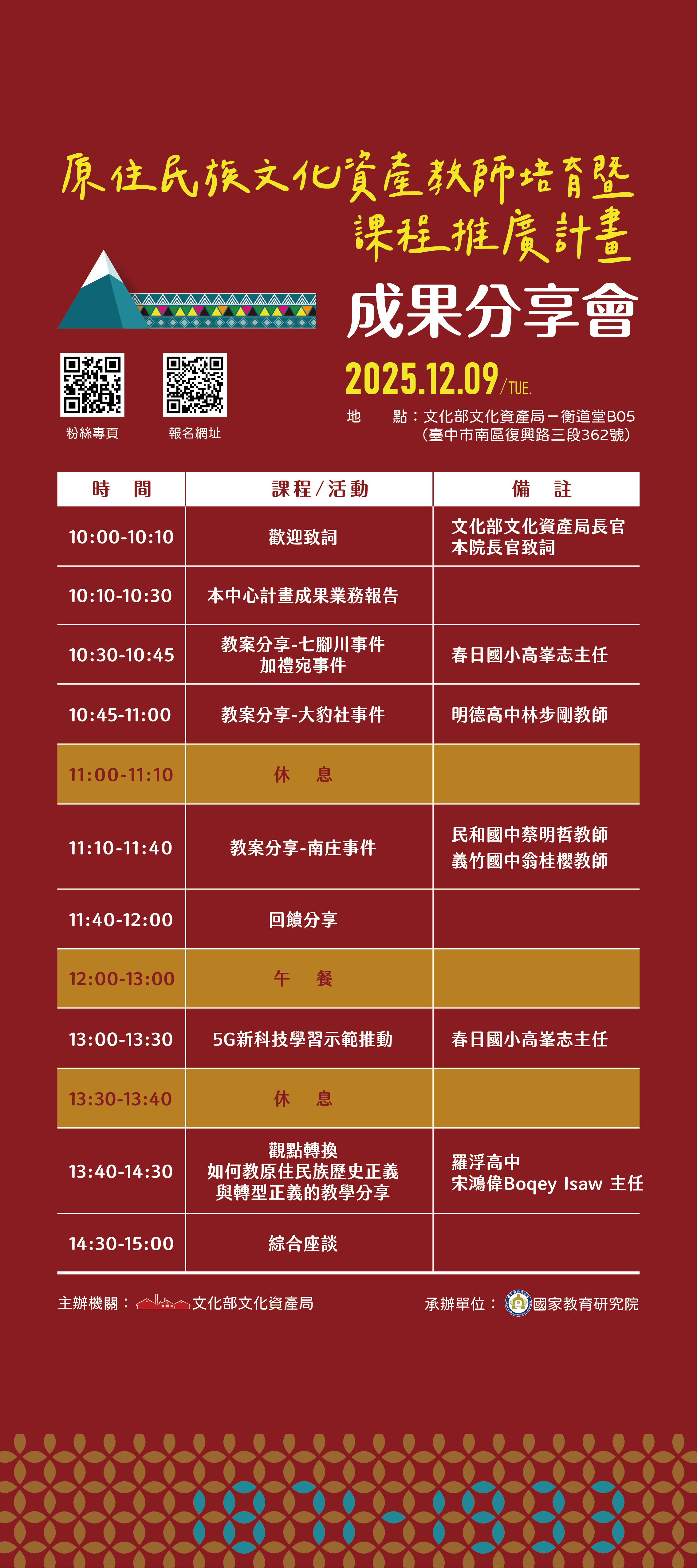 | 2025/12/01 高雄市政府教育局【國家教育研究院辦理「原住民族文化資產教師培育暨推廣課程計畫」成果分享會】 |