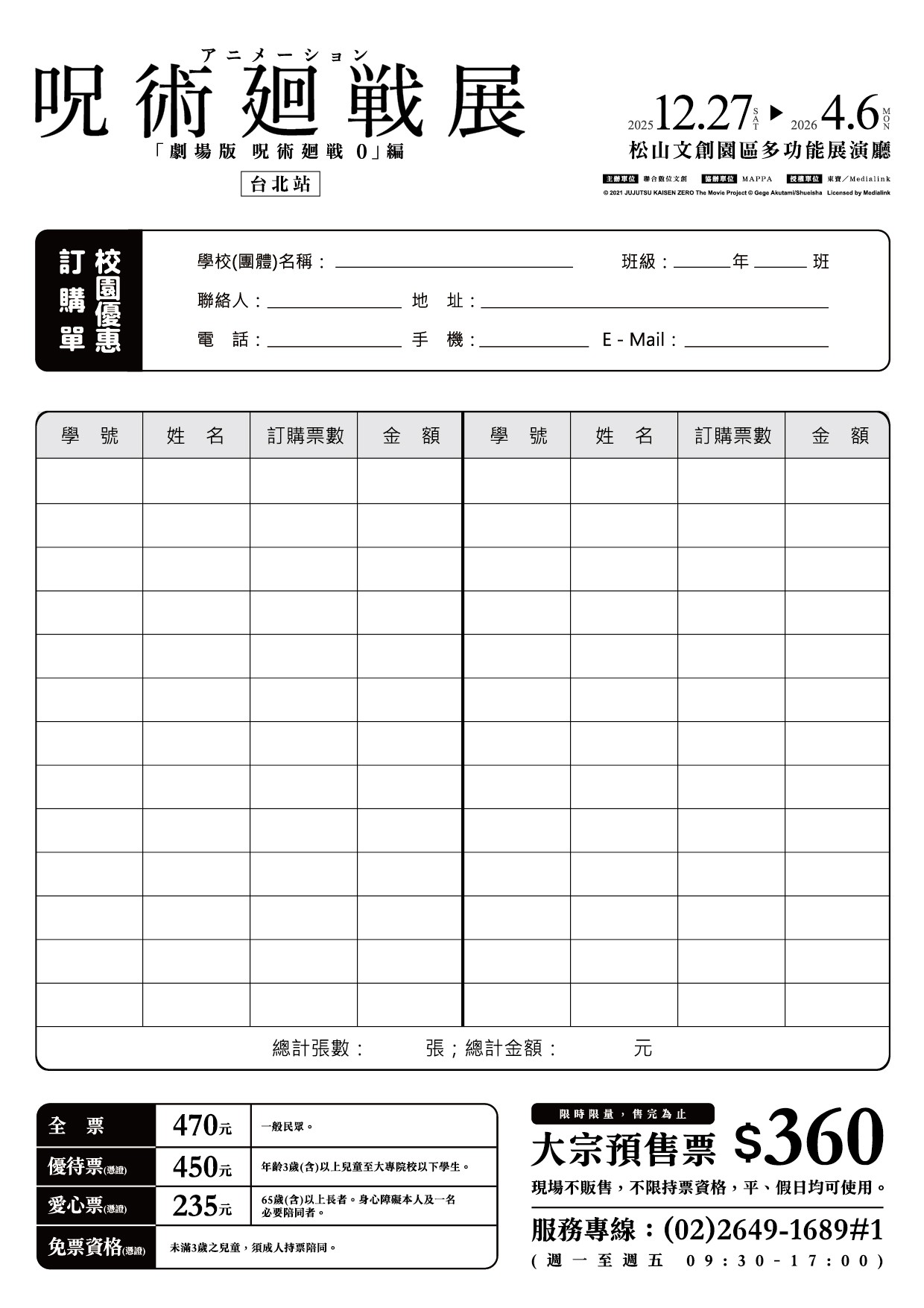 | 2025/12/17 114年12月27日~115年4月6日於台北市松山文 創園區多功能展演廳舉辦「咒術迴戰展《劇場版 咒術迴 戰 0》篇」 |