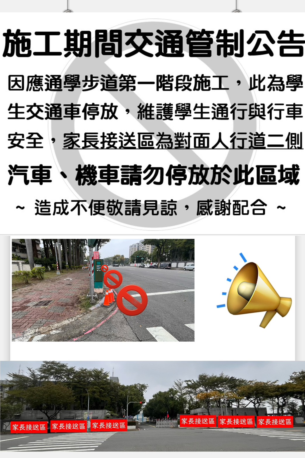 1.因應通學步道第一階段施工,校門左側為學生交通車停放,