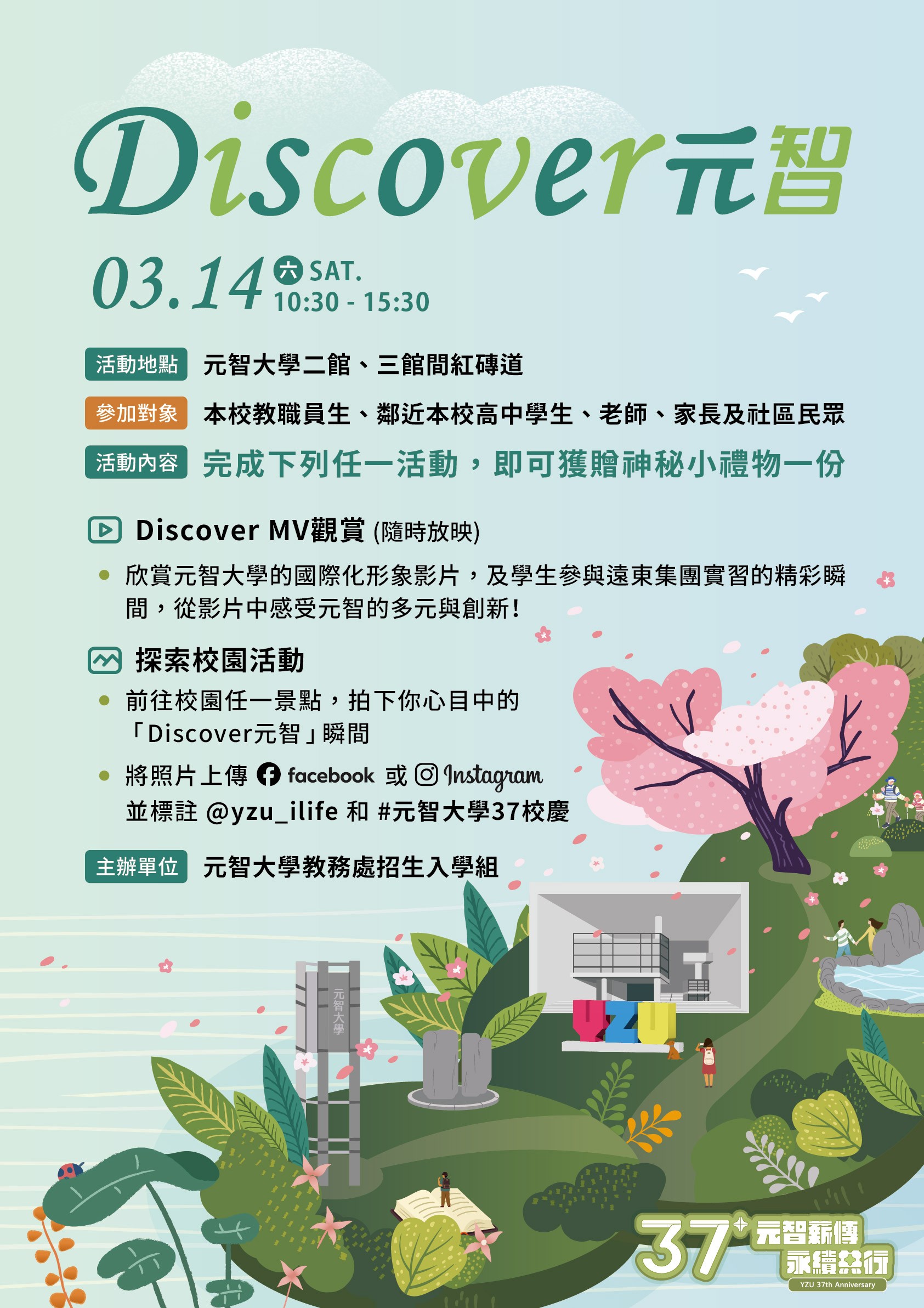 一、本校為慶祝創校37週年,特規劃「Discover 元智」校慶系列活動,透過短片觀賞及校園探索體驗,期協助高中職學生提前認識大學學習環境,作為未來升學規劃之參考,讓參與者深入認識本校國際化辦學特色及多元學習成果。