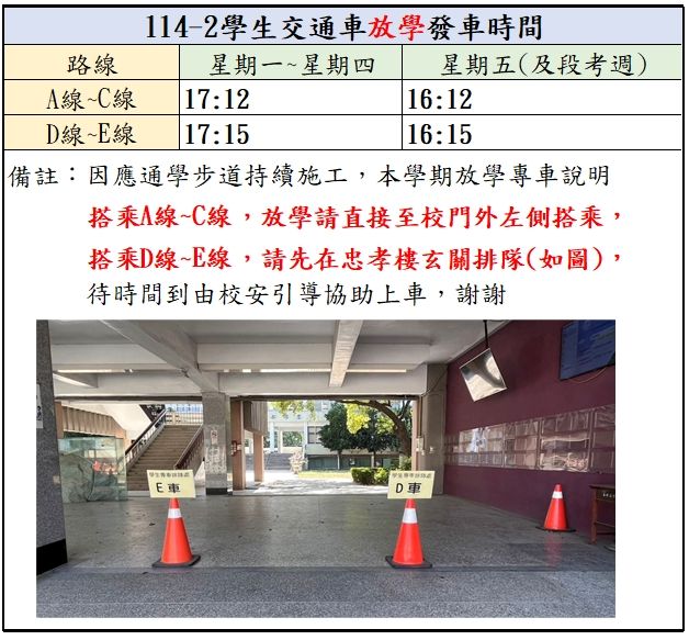 因應通學步道持續施工,114-2學期放學專車搭乘說明