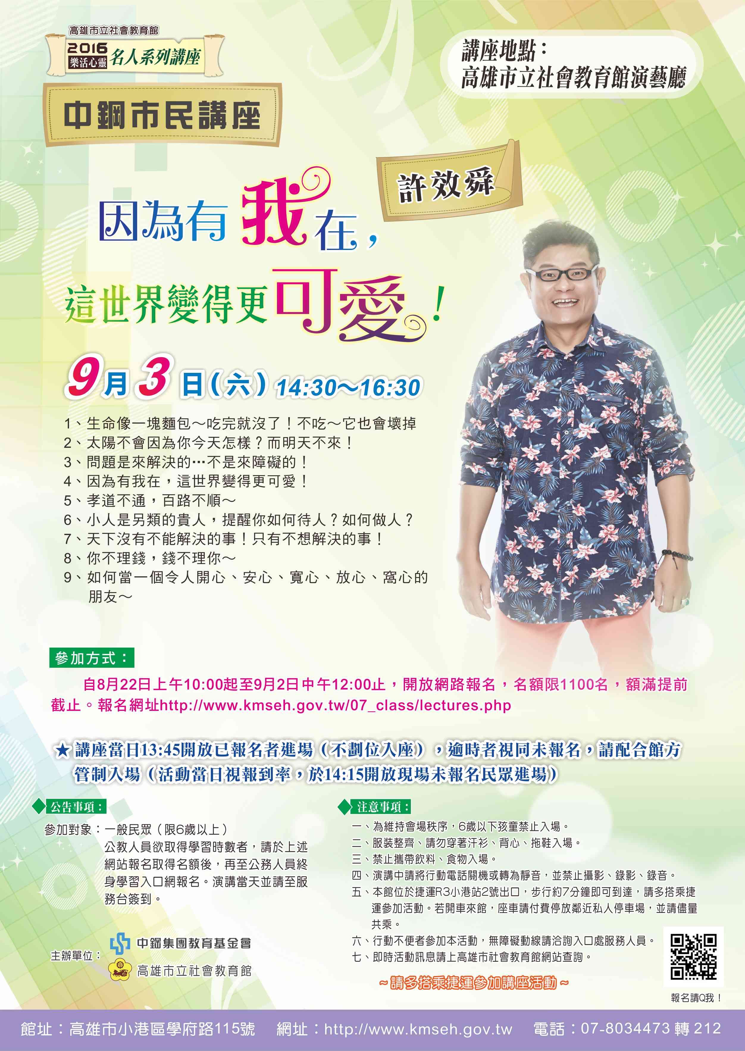 | 2016/08/17 高市社教館講座:9月3日14:30邀請知名藝人許效舜主講「因為有我在,這世界變得更可愛!」,採網路報名,自8月22日上午10:00 起開放受理(額滿截止),詳情請上該館網站查詢。 |