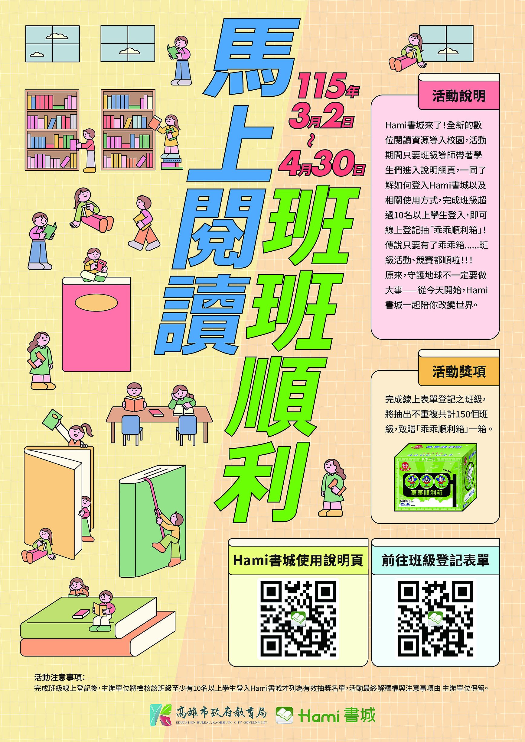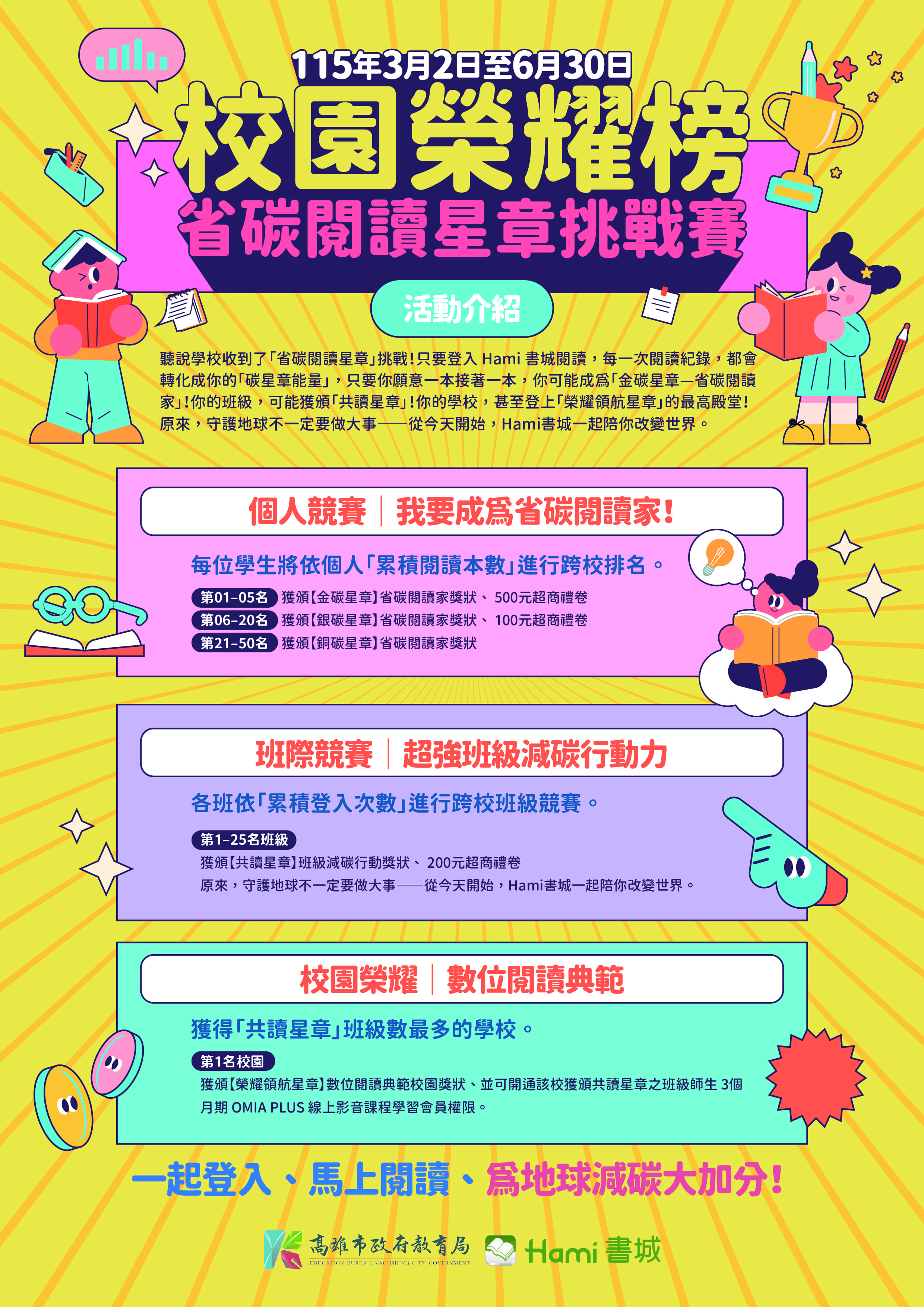 二、為協助校園深化數位閱讀應用,提升學生閱讀素養並推動低碳學習行動,Hami書城規劃於115年3月至6月辦理「Hami書城數位閱讀推廣活動及線上說明會」,透過班級宣導、閱讀競賽及教師線上說明會等方式,引導師生善用Hami書城數位閱讀資源,營造校園閱讀風氣。本次活動特別結合「省碳閱讀」概念,鼓勵學生以實際閱讀行動響應環境永續,使閱讀同時成為愛地球之具體實踐。