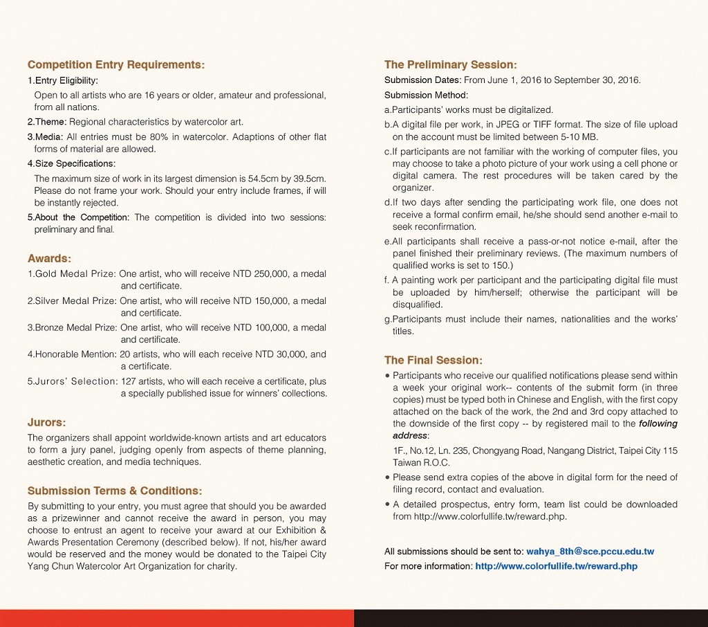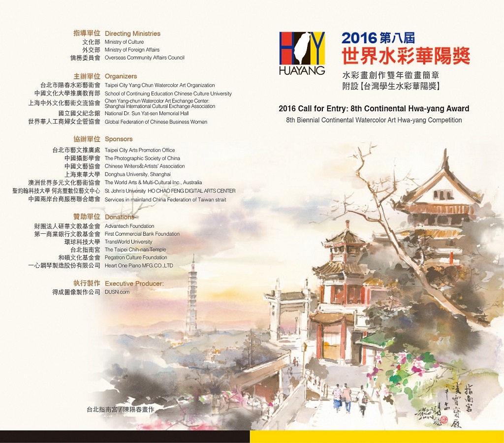 | 2016/08/19 轉知中國文化大學辦理2016第八屆世界水彩華陽獎暨台灣學生華陽獎徵件 |