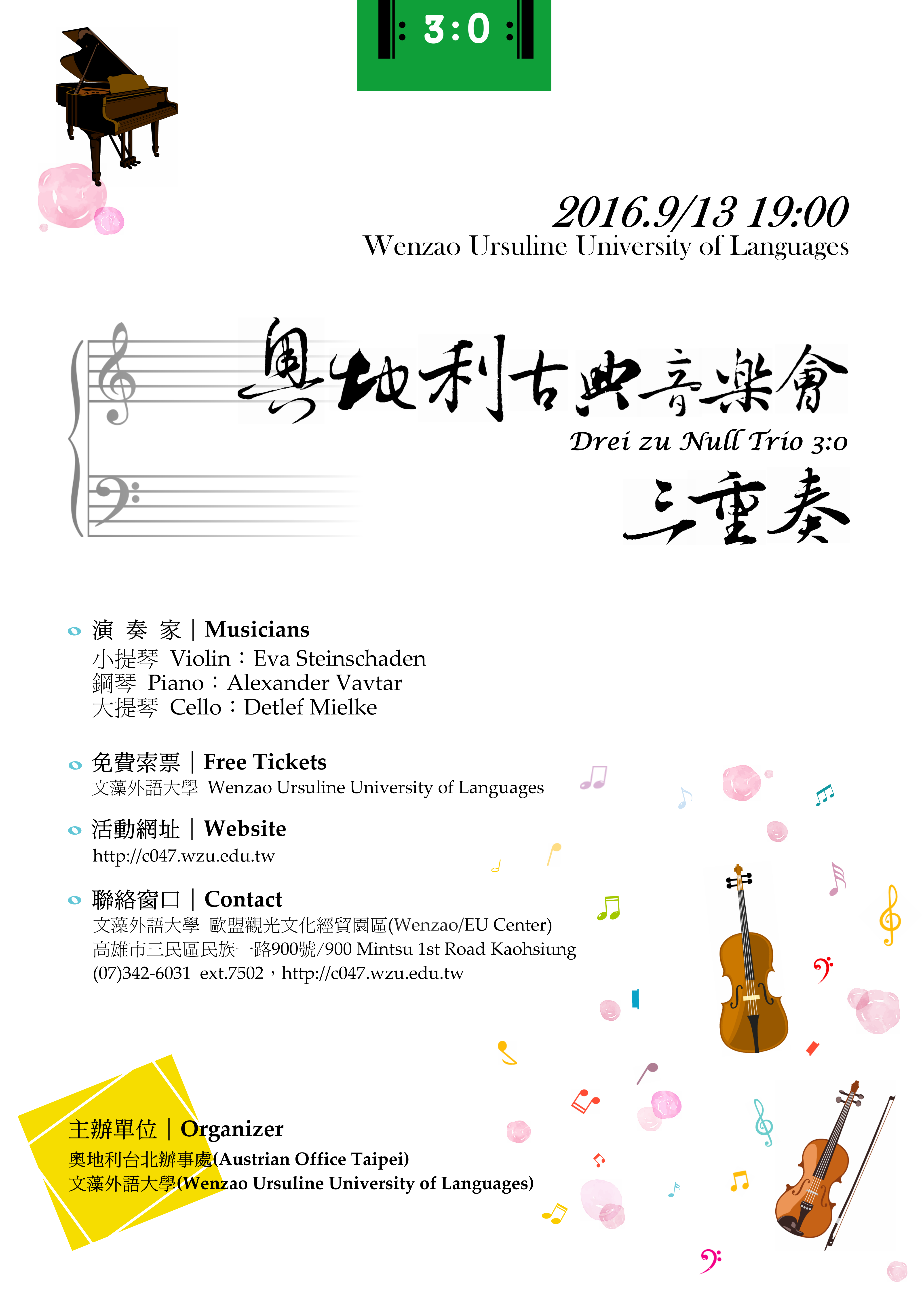 | 2016/08/19 轉知文藻外語大學辦理奧地利古典音樂會-Drei zu Null Trio 3:0三重奏 |