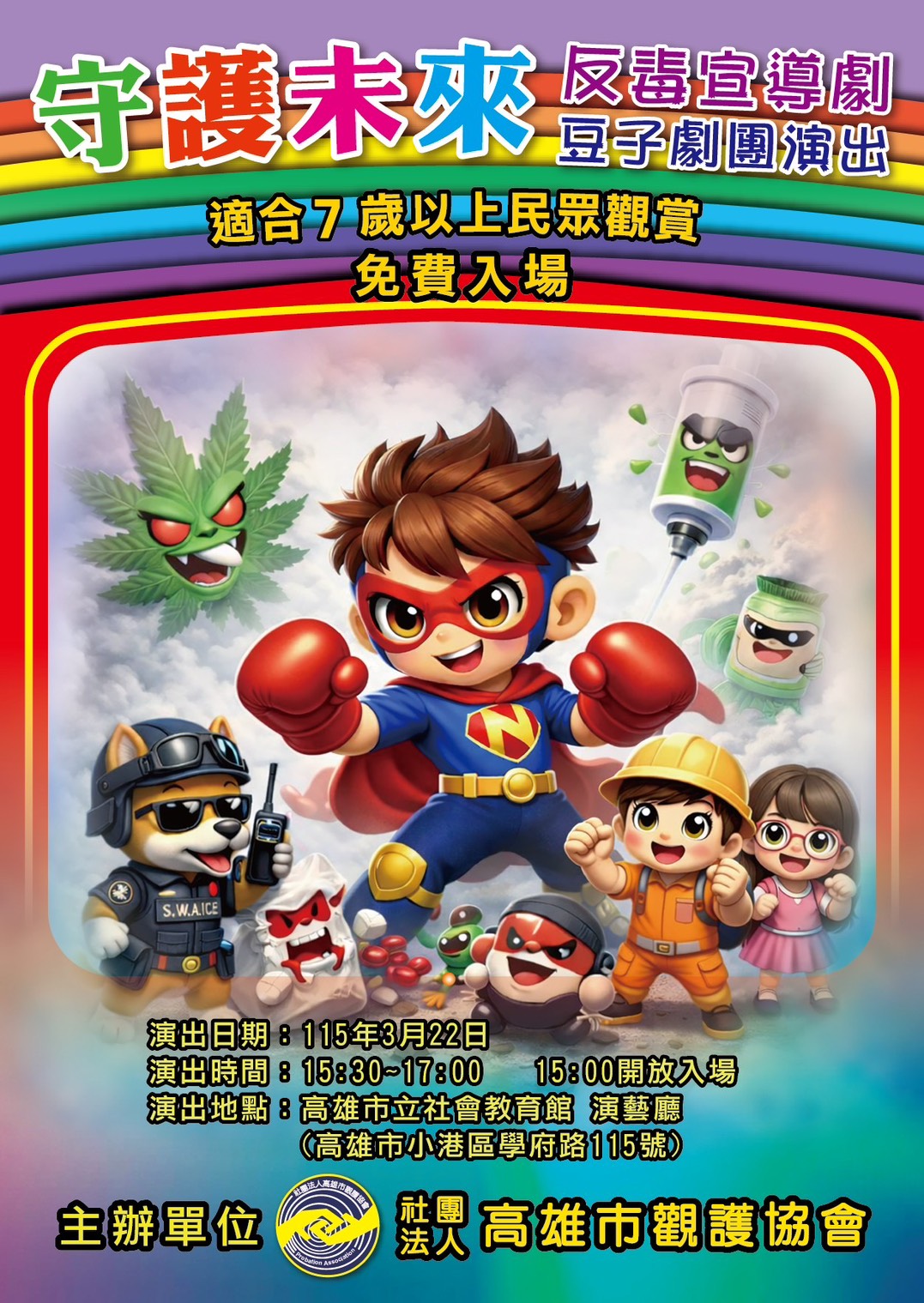| 2026/03/18 函轉高雄市教育局社團法人高雄市觀護協會邀請豆子劇團假本市社教館演出 「守護未來—校園反毒巡迴劇」 |