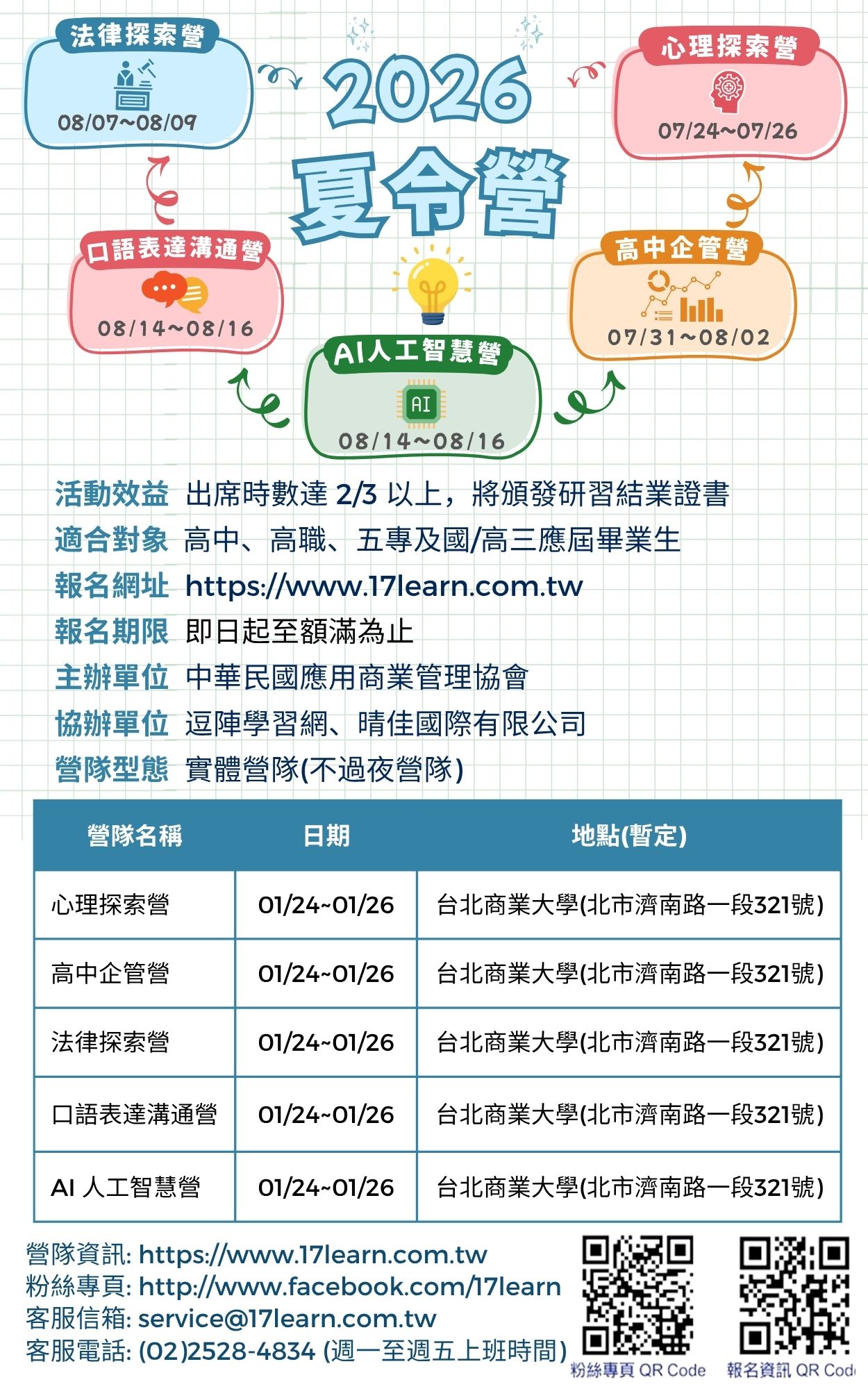 | 2026/04/14 2026夏令營-卓越領袖探索營-社團法人中華民國應用商業管理協會 |