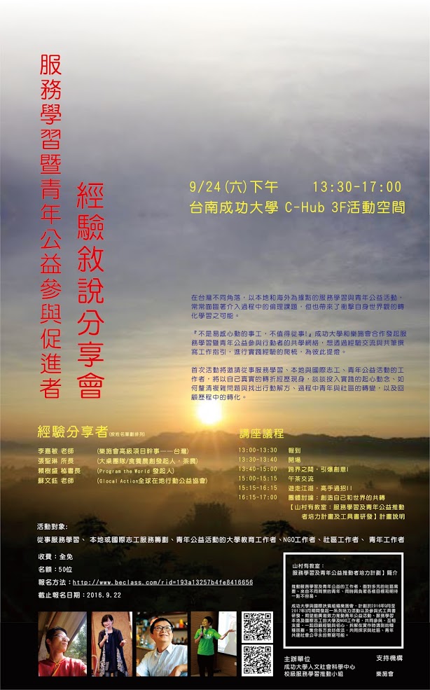 | 2016/09/19 服務學習暨青年公益參與促進者-經驗敘說分享會 |