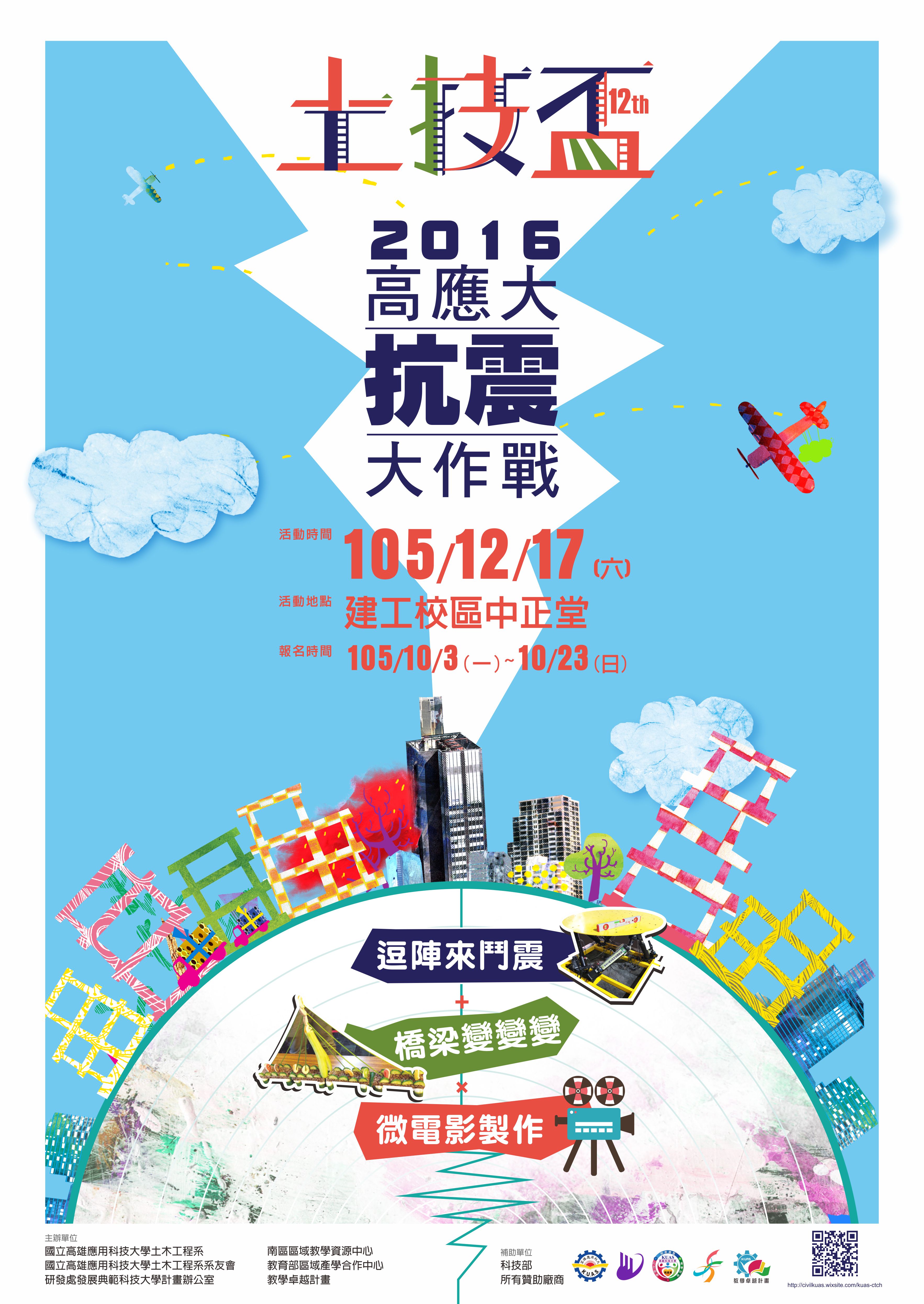| 2016/10/05 轉知高雄應用科技大學「2016高應大抗震大作戰-逗陣來鬥震+橋梁變變變X微電影製作」活動 |