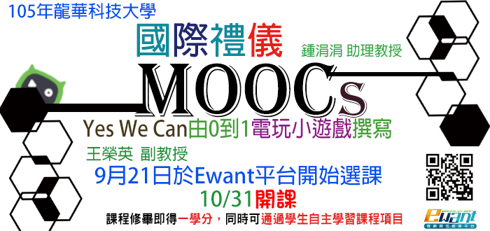 | 2016/10/11 龍華科技大學辦理105學年度磨課師線上課程「國際禮儀」 、「Yes We Can由0到1電玩小遊戲撰寫」兩門課程 |
