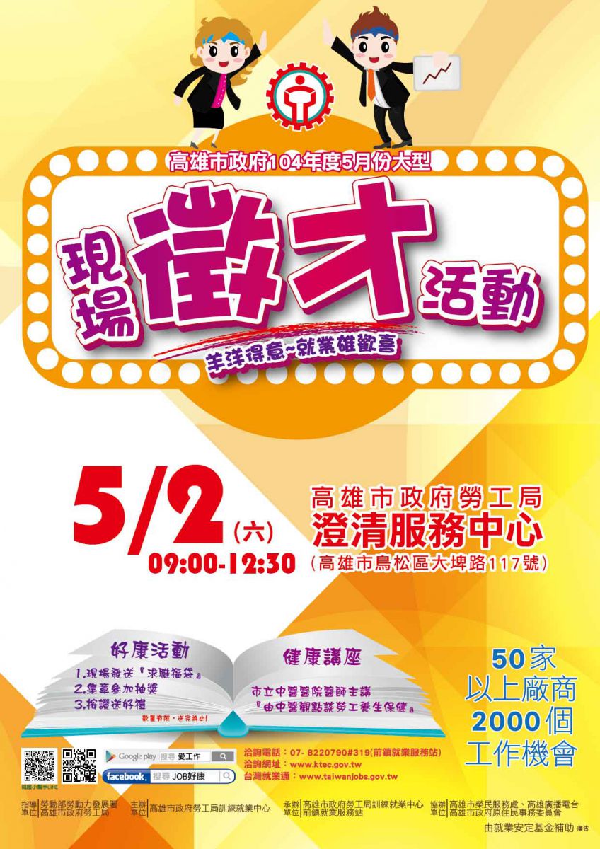 | 宣導內容 | 高市勞工局訓就中心5/2上午9時假高雄市政府勞工局澄清服務中心辦理大型現場徵才活動,歡迎參加。 |