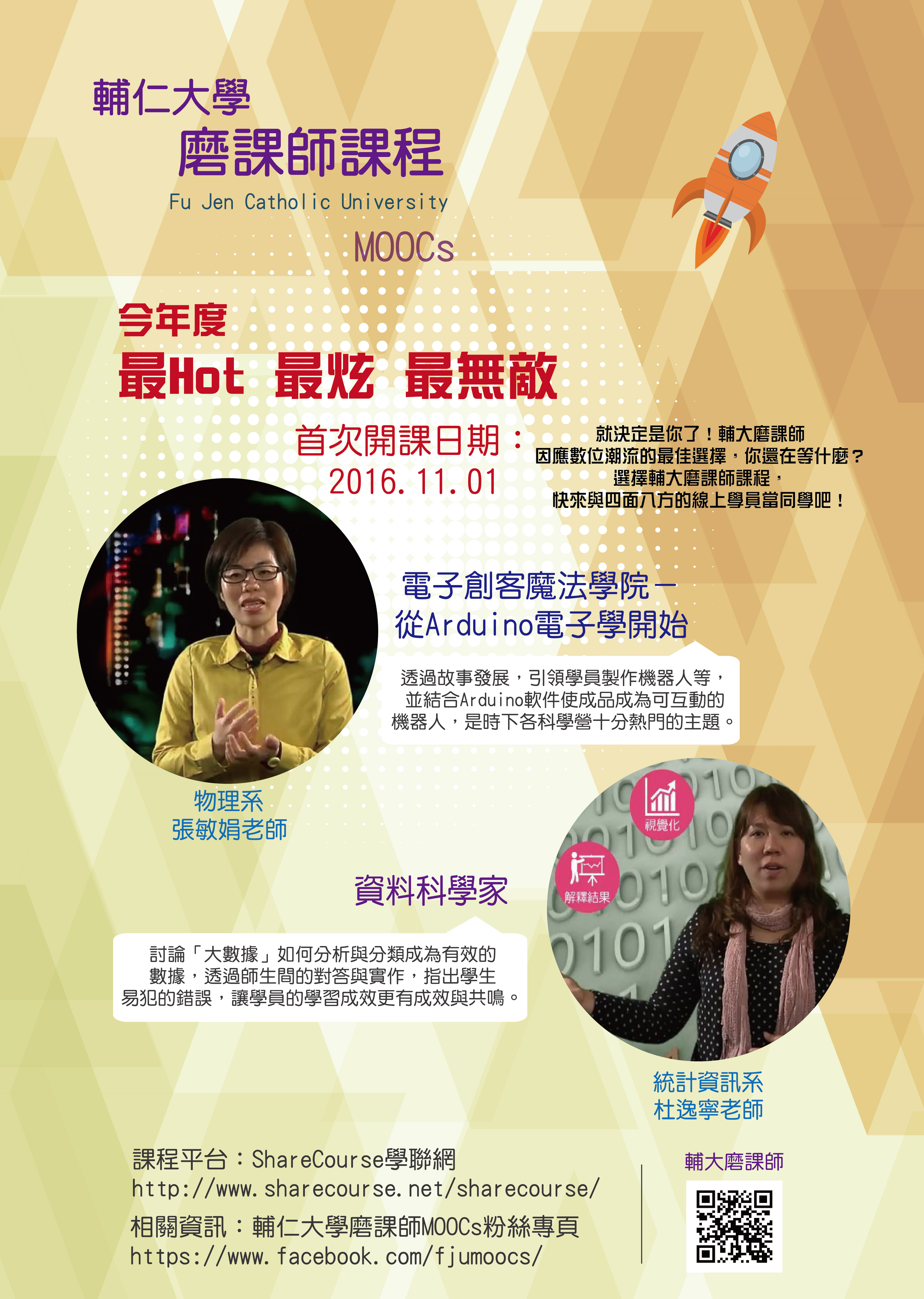 | 2016/10/26 輔仁大學開設二門磨課師線上開放課程「電子創客魔法學院-從Arduino電子學開始」及「資料科學家」 |