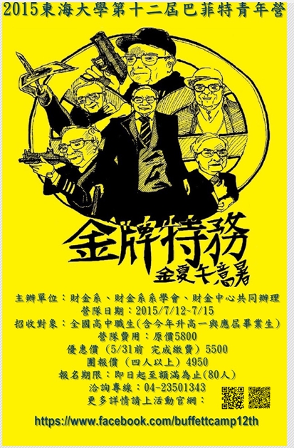| 2015/04/30 東海大學辦理四天三夜理財營隊『第十二屆東海巴菲特青年財金成長營-金牌特務:金夏午意暑』活動,請同學踴躍參加。 |