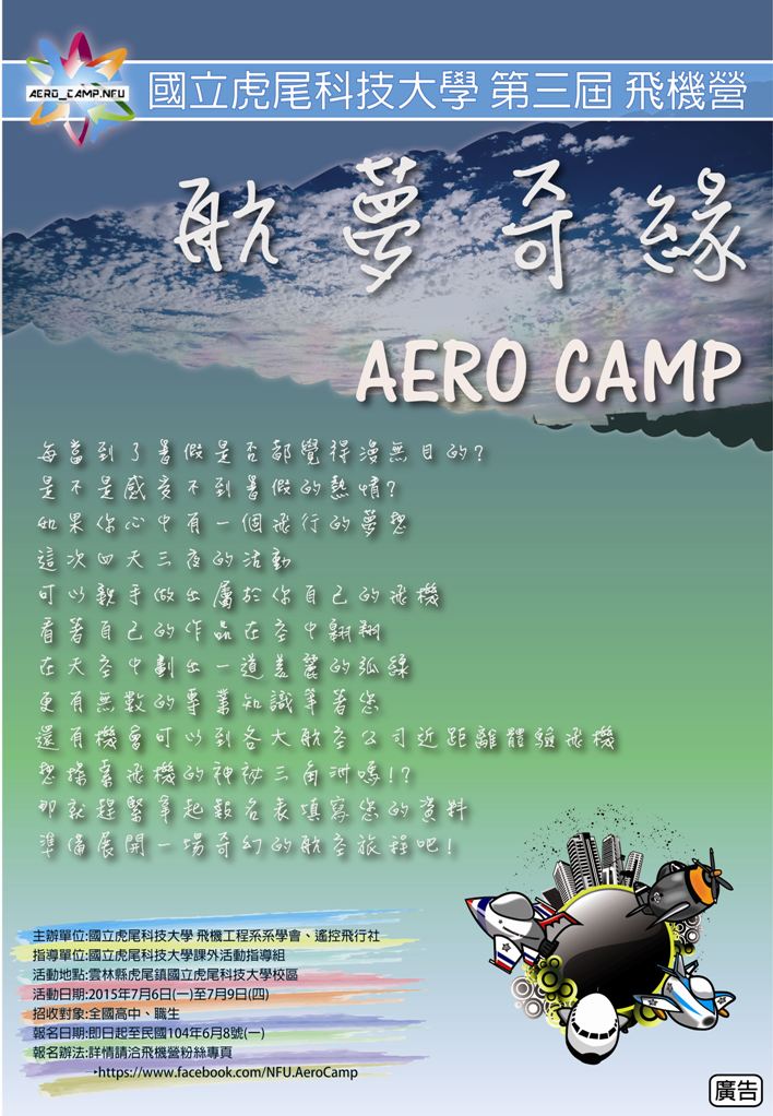 國立虎尾科技大學辦理「第三屆飛機營-航夢奇緣」活動,請學生踴躍參加。