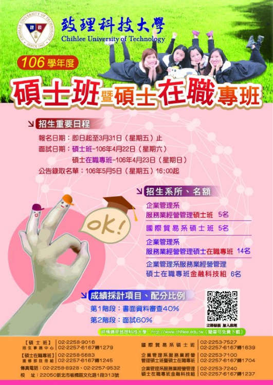 | 2017/03/13 致理學校財團法人致理科技大學106學年度碩士班暨碩士在職專班招生相關資訊 |