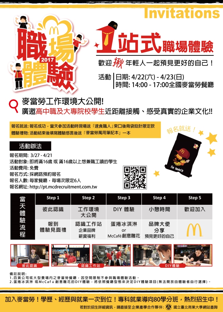 | 2017/03/16 國立臺北商業大學與台灣麥當勞餐廳股份有限公司合作辦理「2017年台灣麥當勞OneStopHiring Forword全國職場體驗活動」 |