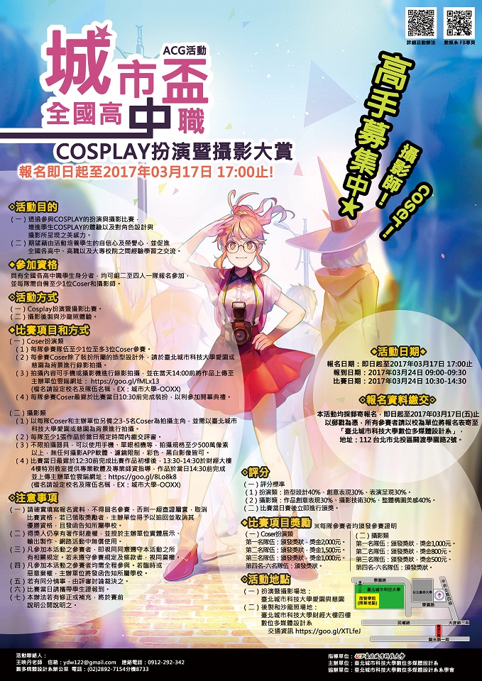 | 2017/03/16 城市學校財團法人臺北城市科技大學「2017第一屆城市盃全國高中職ACG活動-COSPLAY扮演暨攝影大賞」 |
