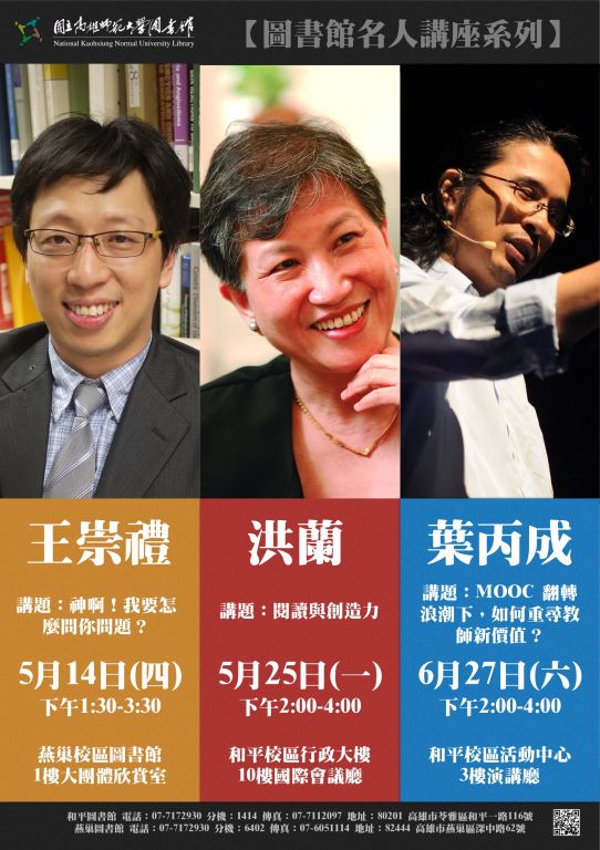 1、第一場:神啊!我要怎麼問你問題?(王崇禮教授),104年5月14日(星期四)下午1時30分至3時30分;該校燕巢校區圖資大樓1樓大團體欣賞室。