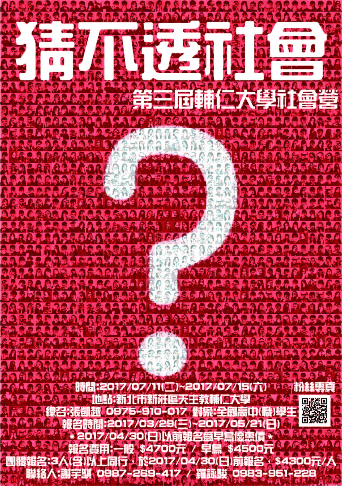 輔仁大學學校財團法人輔仁大學社會學系學會辦理二0一七年「2017第三屆輔大社會營《猜不透社會》」報名簡章乙份