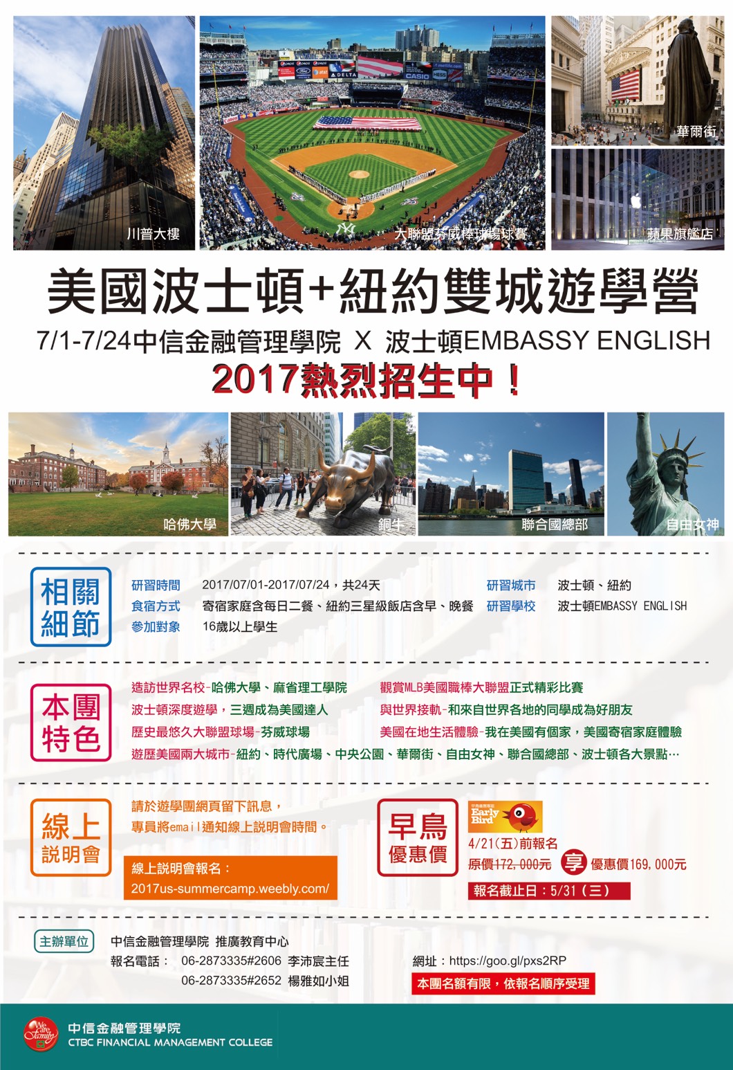 | 2017/04/09 中信學校財團法人中信金融管理學院推廣教育中心辦理美國暑期遊學營「美國波士頓+紐約雙城遊學營」 |