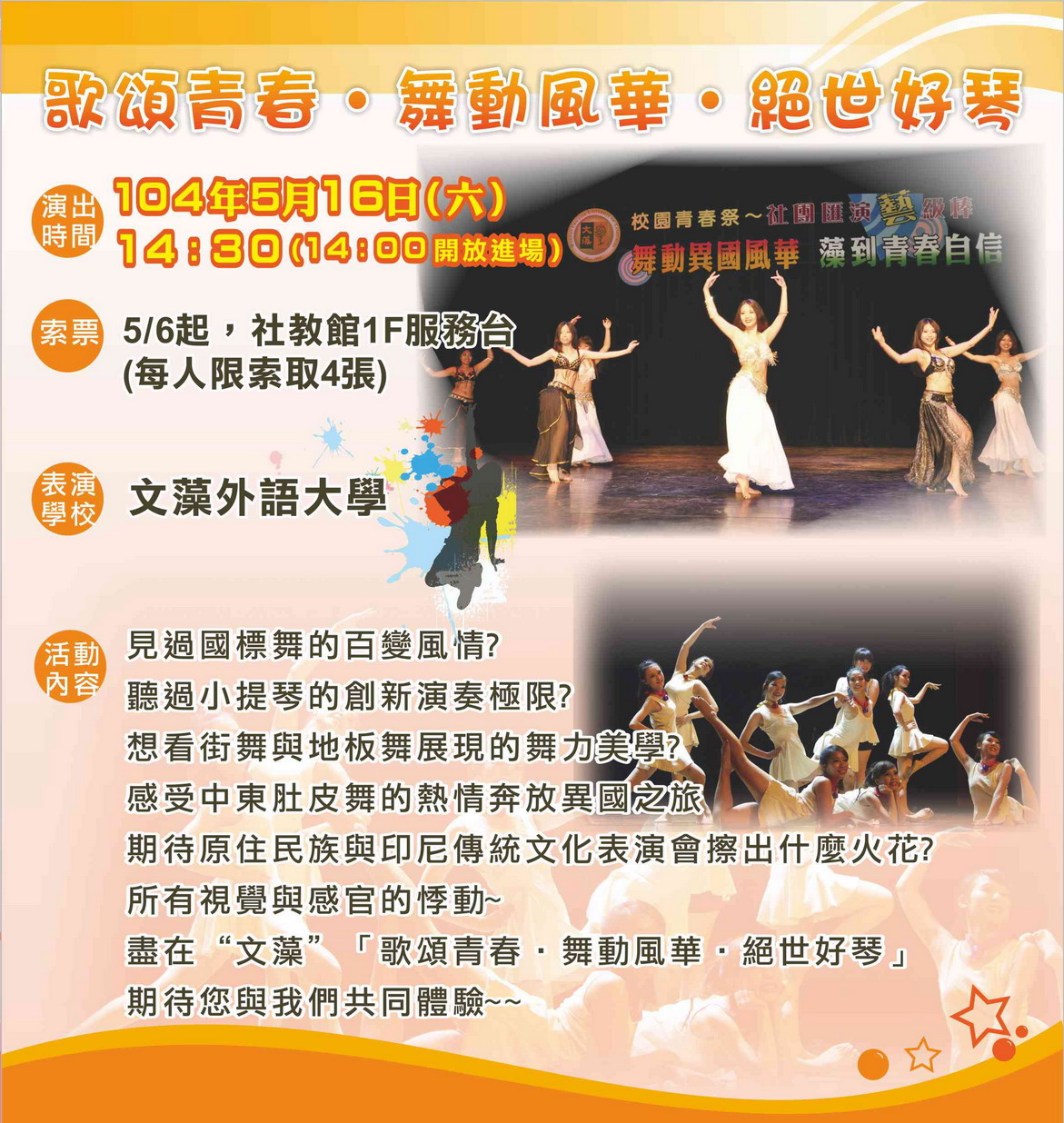 一、演出時間:104年5月16日(六)14:30,由文藻外語大學擔綱演出,地點:該館演藝廳。